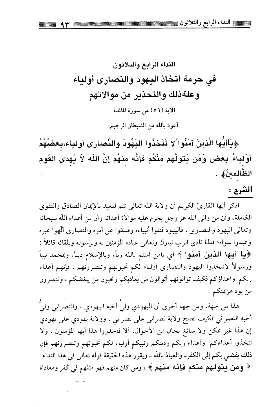 النداء الرابع والثلاثون: في حرمة اتخاذ اليهود والنصارى أولياء وعلة ذلك والتحذير من موالاتهم