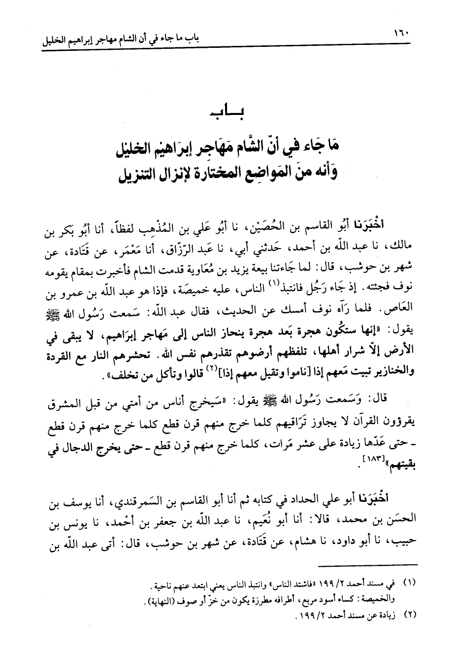 باب ما جاء في أن الشام مهاجر إبراهيم الخليل وأنه من المواضع المختارة لإنزال التنزيل " أخبرنا أبو القاسم بن الحصين نا أبو علي بن المذهب لفظا أنا أبو بكر بن مالك نا عبد الله بن أحمد حدثني أبي نا عبد الرزاق أنا معمر عن قتادة عن شهر بن حوشب قال لما جاءتنا بيعة يزيد بن معاوية قدمت الشام فأخبرت بمقام يقومه نوف فجئته إذ جاء رجل فانتبذ (1) الناس عليه خميصة فإذا هو عبد الله بن عمرو بن العاص فلما رآه نوف أمسك عن الحديث فقال عبد الله سمعت رسول الله (صلى الله عليه وسلم) يقول إنها ستكون هجرة بعد هجرة ينحاز الناس إلى مهاجر إبراهيم لا يبقى في الأرض إلا شرار أهلها تلفظهم أرضوهم تقذرهم نفس الله تحشرهم النار مع القردة والخنازير تبيت معهم إذا ناموا وتقيل معهم إذا (2) قالوا وتأكل من تخلف قال وسمعت رسول الله (صلى الله عليه وسلم) يقول سيخرج أناس من أمتي من قبل المشرق يقرؤون القرآن لا يجاوز تراقيهم كلما خرج منهم قرن قطع كلما خرج منهم قرن قطع حتى عدها زيادة على عشر مرات كلما خرج منهم قرن قطع حتى يخرج الدجال في بقيتهم أخبرنا أبو علي الحداد في كتابه ثم أنا أبو القاسم بن السمرقندي أنا يوسف بن الحسن بن محمد قالا أنا أبو نعيم نا عبد الله بن جعفر بن أحمد نا يونس بن حبيب نا أبو داود نا هشام عن قتادة عن شهر بن حوشب قال أتى عبد الله بن