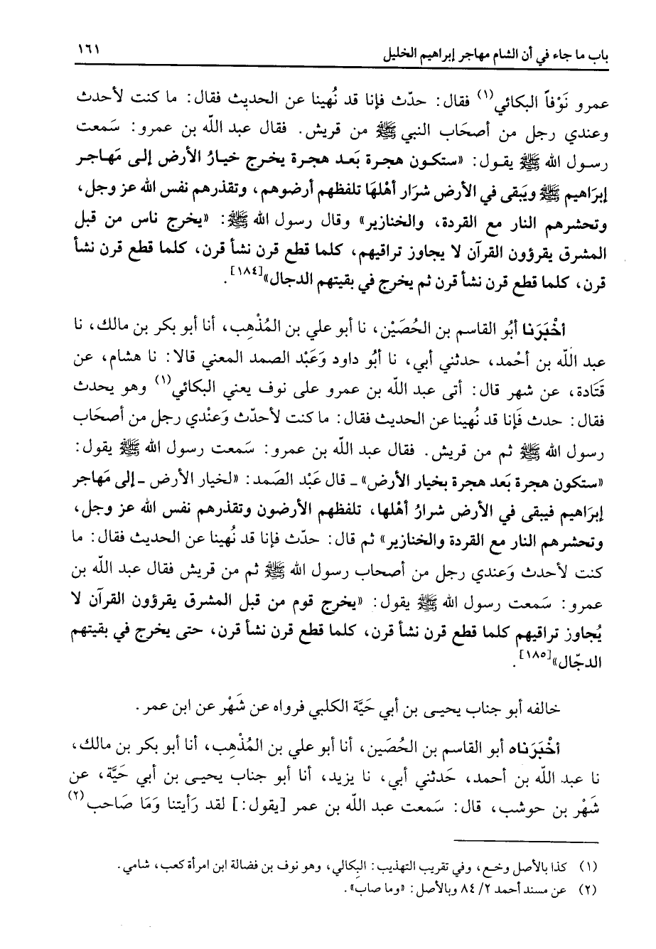 عمرو نوفا البكائي (1) فقال حدث فإنا قد نهينا عن الحديث فقال ما كنت لأحدث وعندي رجل من أصحاب النبي (صلى الله عليه وسلم) من قريش فقال عبد الله بن عمرو سمعت رسول الله (صلى الله عليه وسلم) يقول ستكون هجرة بعد هجرة يخرج خيار الأرض إلى مهاجر إبراهيم (صلى الله عليه وسلم) ويبقى في الأرض شرار أهلها تلفظهم أرضوهم وتقذرهم نفس الله عز وجل وتحشرهم النار مع القردة والخنازير وقال رسول الله (صلى الله عليه وسلم) يخرج ناس من قبل المشرق يقرؤون القرآن لا يجاوز تراقيهم كلما قطع قرن نشأ قرن كلما قطع قرن نشأ قرن كلما قطع قرن نشأ قرن ثم يخرج في بقيتهم الدجال أخبرنا أبو القاسم بن الحصين نا أبو علي بن المذهب أنا أبو بكر بن مالك نا عبد الله بن أحمد حدثني أبي نا أبو داود وعبد الصمد المعني قالا نا هشام عن قتادة عن شهر قال أتى عبد الله بن عمرو على نوف يعني البكائي (1) وهو يحدث فقال حدث فإنا قد نهينا عن الحديث فقال ما كنت لأحدث وعندي رجل من أصحاب رسول الله (صلى الله عليه وسلم) ثم من قريش فقال عبد الله بن عمرو سمعت رسول الله (صلى الله عليه وسلم) يقول ستكون هجرة بعد هجرة بخيار الأرض قال عبد الصمد لخيار الأرض إلى مهاجر إبراهيم فيبقى في الأرض شرار أهلها تلفظهم الأرضون وتقذرهم نفس الله عز وجل وتحشرهم النار مع القردة والخنازير ثم قال حدث فإنا قد نهينا عن الحديث فقال ما كنت لأحدث وعندي رجل من أصحاب رسول الله (صلى الله عليه وسلم) ثم من قريش فقال عبد الله بن عمرو سمعت رسول الله (صلى الله عليه وسلم) يقول يخرج قوم من قبل المشرق يقرؤون القرآن لا يجاوز تراقيهم كلما قطع قرن نشأ قرن كلما قطع قرن نشأ قرن حتى يخرج في بقيتهم الدجال خالفه أبو جناب يحيى بن أبي حية الكلبي فرواه عن شهر عن ابن عمر أخبرناه أبو القاسم بن الحصين أنا أبو علي بن المذهب أنا أبو بكر بن مالك نا عبد الله بن أحمد حدثني أبي نا يزيد أنا أبو جناب يحيى بن أبي حية عن شهر بن حوشب قال سمعت عبد الله بن عمر يقول لقد رأيتنا وما صاحب (2)
