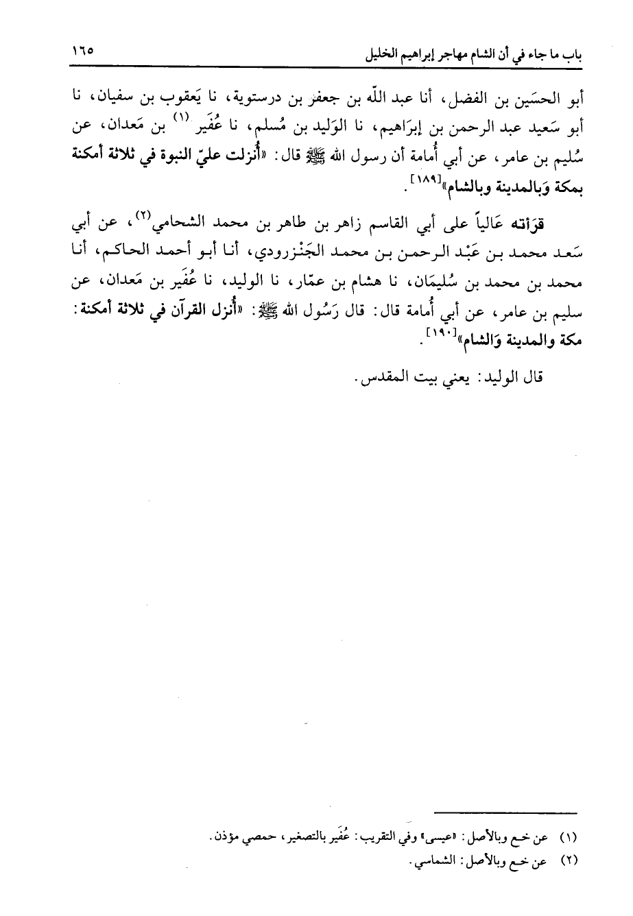 أبو الحسين بن الفضل أنا عبد الله بن جعفر بن درستوية نا يعقوب بن سفيان نا أبو سعيد عبد الرحمن بن إبراهيم نا الوليد بن مسلم نا عفير (1) بن معدان عن سليم بن عامر عن أبي أمامة أن رسول الله (صلى الله عليه وسلم) قال أنزلت علي النبوة في ثلاثة أمكنة بمكة وبالمدينة وبالشام قرأته عاليا على أبي القاسم زاهر بن طاهر بن محمد الشحامي (2) عن أبي سعد محمد بن عبد الرحمن بن محمد الجنزرودي أنا أبو أحمد الحاكم أنا محمد بن محمد بن سليمان نا هشام بن عمار نا الوليد نا عفير بن معدان عن سليم بن عامر عن أبي أمامة قال قال رسول الله (صلى الله عليه وسلم) أنزل القرآن في ثلاثة أمكنة مكة والمدينة والشام قال الوليد يعني بيت المقدس "