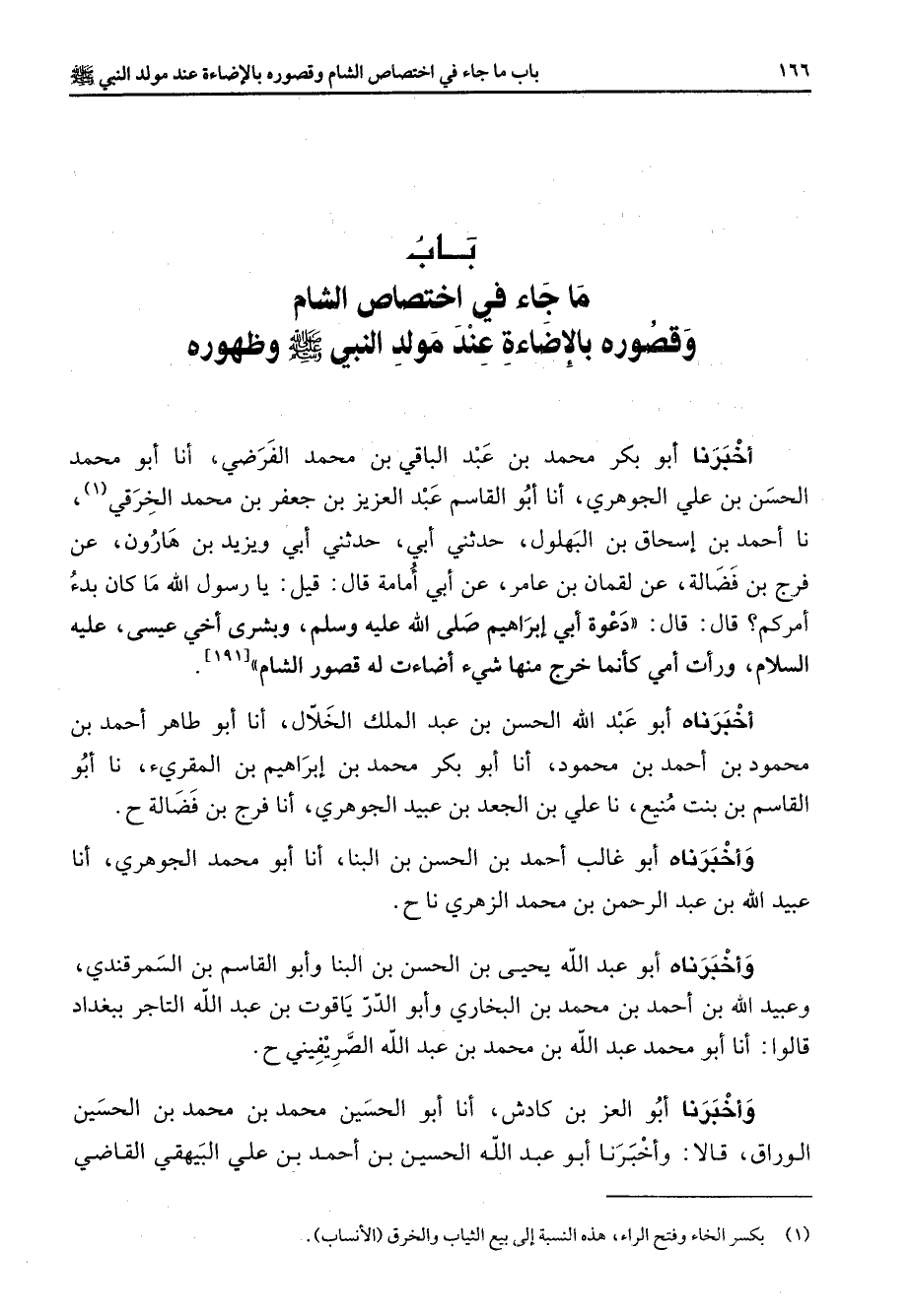 باب ما جاء في اختصاص الشام وقصوره بالإضاءة عند مولد النبي (صلى الله عليه وسلم) وظهوره " أخبرنا أبو بكر محمد بن عبد الباقي بن محمد الفرضي أنا أبو محمد الحسن بن علي الجوهري أنا أبو القاسم عبد العزيز بن جعفر بن محمد الخرقي (1) نا أحمد بن إسحاق بن البهلول حدثني أبي حدثني أبي ويزيد بن هارون عن فرج بن فضالة عن لقمان بن عامر عن أبي أمامة قال قيل يا رسول الله ما كان بدء أمركم قال قال دعوة أبي إبراهيم (صلى الله عليه وسلم) وبشرى أخي عيسى عليه السلام ورأت أمي كأنما خرج منها شئ أضاءت له قصور الشام أخبرناه أبو عبد الله الحسن بن عبد الملك الخلال أنا أبو طاهر أحمد بن محمود بن أحمد بن محمود أنا أبو بكر محمد بن إبراهيم بن المقرئ نا أبو القاسم بن بنت منيع نا علي بن الجعد بن عبيد الجوهري أنا فرج بن فضالة وأخبرناه أبو غالب أحمد بن الحسن بن البنا أنا أبو محمد الجوهري أنا عبيد الله بن عبد الرحمن بن محمد الزهري نا وأخبرناه أبو عبد الله يحيى بن الحسن بن البنا وأبو القاسم بن السمرقندي وعبيد الله بن أحمد بن محمد بن البخاري وأبو الدر ياقوت بن عبد الله التاجر ببغداد قالوا أنا أبو محمد عبد الله بن محمد بن عبد الله الصريفيني وأخبرنا أبو العز بن كادش أنا أبو الحسين محمد بن محمد بن الحسين الوراق قالا وأخبرنا أبو عبد الله الحسين بن أحمد بن علي البيهقي القاضي