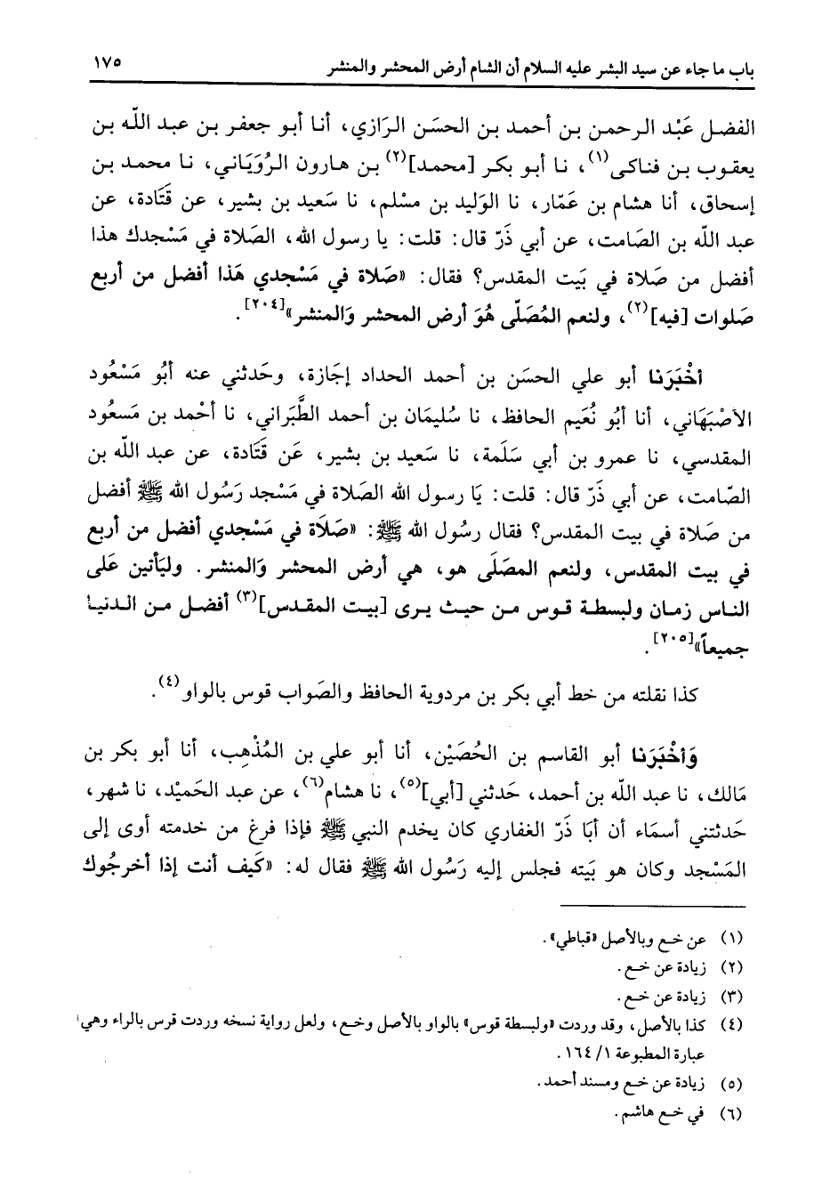 الفضل عبد الرحمن بن أحمد بن الحسن الرازي أنا أبو جعفر بن عبد الله بن يعقوب بن فناكي (1) نا أبو بكر محمد (2) بن هارون الروياني نا محمد بن إسحاق أنا هشام بن عمار نا الوليد بن مسلم نا سعيد بن بشير عن قتادة عن عبد الله بن الصامت عن أبي ذر قال قلت يا رسول الله الصلاة في مسجدك هذا أفضل من صلاة في بيت المقدس فقال صلاة في مسجدي هذا افضل من أربع صلوات فيه (2) ولنعم المصلى هو أرض المحشر والمنشر [* * *] أخبرنا أبو علي الحسن بن أحمد الحداد إجازة وحدثني عنه أبو مسعود الاصبهاني أنا أبو نعيم الحافظ نا سليمان بن أحمد الطبراني نا أحمد بن مسعود المقدسي نا عمرو بن أبي سلمة نا سعيد بن بشير عن قتادة عن عبد الله بن الصامت عن أبي ذر قال قلت يا رسول الله الصلاة في مسجد رسول الله (صلى الله عليه وسلم) أفضل من صلاة في بيت المقدس فقال رسول الله (صلى الله عليه وسلم) صلاة في مسجدي أفضل من اربع في بيت المقدس ولنعم المصلى هو هي أرض المحشر والمنشر وليأتين على الناس زمان ولبسطة قوس من حيث يرى بيت المقدس (3) أفضل من الدنيا جميعا كذا نقلته من خط أبي بكر بن مردوية الحافظ والصواب قوس بالواو (4) وأخبرنا أبو القاسم بن الحصين أنا أبو علي بن المذهب أنا أبو بكر بن مالك نا عبد الله بن أحمد حدثني أبي (5) نا هشام (6) عن عبد الحميد نا شهر حدثتني أسماء أن أبا ذر الغفاري كان يخدم النبي (صلى الله عليه وسلم) فإذا فرغ من خدمته أوى إلى المسجد وكان هو بيته فجلس إليه رسول الله (صلى الله عليه وسلم) فقال له كيف أنت إذا أخرجوك
