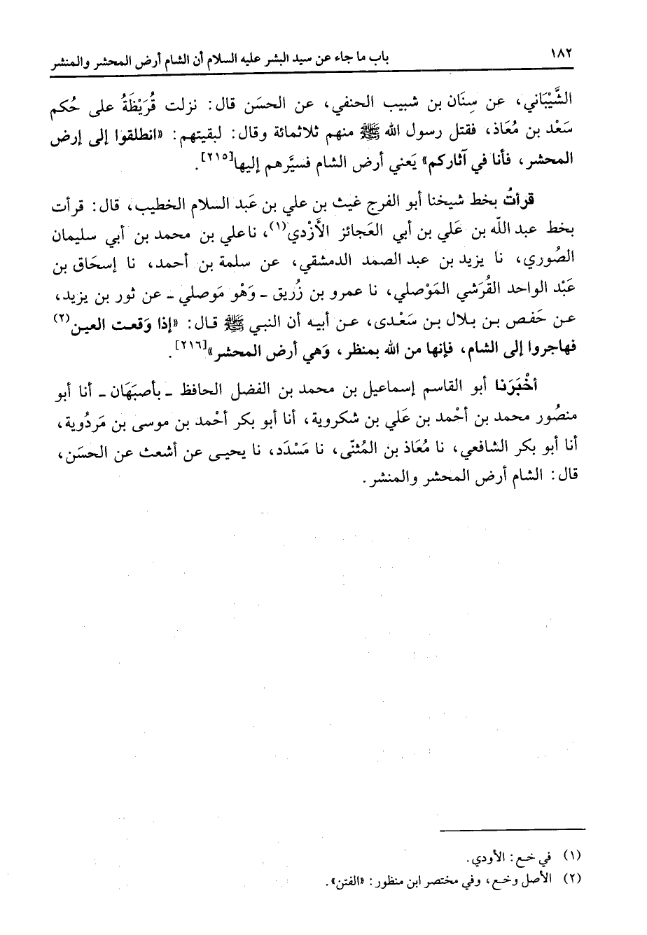 الشيباني عن سنان بن شبيب الحنفي عن الحسن قال نزلت قريظة على حكم سعد بن معاذ فقتل رسول الله (صلى الله عليه وسلم) منهم ثلاثمائة وقال لبقيتهم انطلقوا إلى أرض المحشر فأنا في آثاركم يعني أرض الشام فسيرهم إليها قرأت بخط شيخنا أبو الفرج غيث بن علي بن عبد السلام الخطيب قال قرأت بخط عبد الله بن علي بن أبي العجائز الأزدي (1) نا علي بن محمد بن أبي سليمان الصوري نا يزيد بن عبد الصمد الدمشقي عن سلمة بن أحمد نا إسحاق بن عبد الواحد القرشي الموصلي نا عمرو بن زريق وهو موصلي عن ثور بن يزيد عن حفص بن بلال بن سعدى عن أبيه أن النبي (صلى الله عليه وسلم) قال إذا وقعت العين (2) فهاجروا إلى الشام فإنها من الله بمنظر وهي أرض المحشر أخبرنا أبو القاسم إسماعيل بن محمد بن الفضل الحافظ بأصبهان أنا أبو منصور محمد بن أحمد بن علي بن شكروية أنا أبو بكر أحمد بن موسى بن مردوية أنا أبو بكر الشافعي نا معاذ بن المثنى نا مسدد نا يحيى عن أشعث عن الحسن قال الشام ارض المحشر والمنشر "