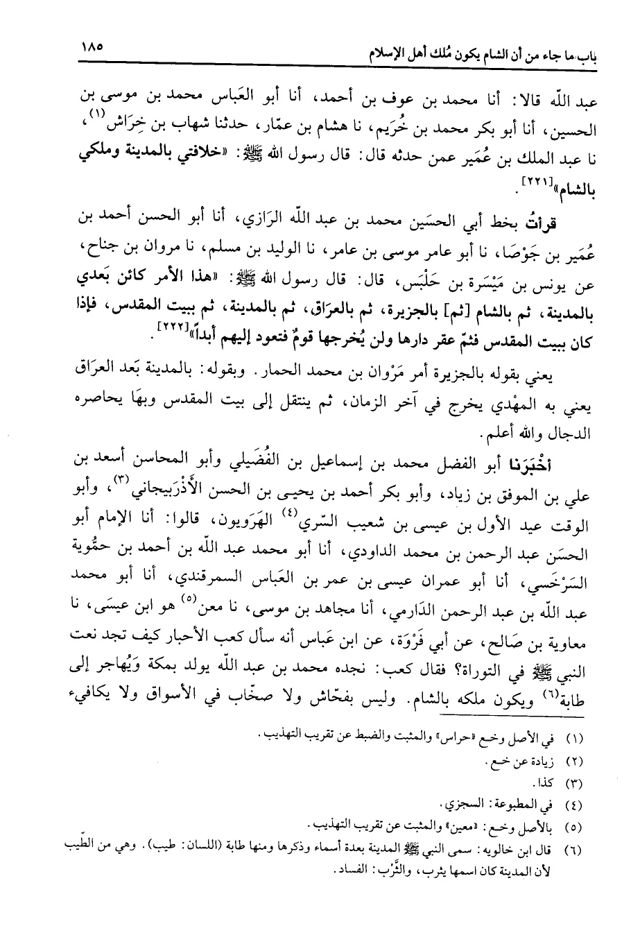 عبد الله قالا أنا محمد بن عوف بن أحمد أنا أبو العباس محمد بن موسى بن الحسين أنا أبو بكر محمد بن خريم نا هشام بن عمار حدثنا شهاب بن خراش (1) نا عبد الملك بن عمير عمن حدثه قال قال رسول الله (صلى الله عليه وسلم) خلافتي بالمدينة وملكي بالشام قرأت بخط أبي الحسين محمد بن عبد الله الرازي أنا أبو الحسن أحمد بن عمير بن جوصا نا أبو عامر موسى بن عامر نا الوليد بن مسلم نا مروان بن جناح عن يونس بن ميسرة بن حلبس قال قال رسول الله (صلى الله عليه وسلم) هذا الأمر كائن بعدي بالمدينة ثم بالشام ثم بالجزيرة ثم بالعراق ثم بالمدينة ثم ببيت المقدس فإذا كان ببيت المقدس فثم عقر دارها ولن يخرجها قوم فتعود إليهم أبدا يعني بقوله بالجزيرة أمر مروان بن محمد الحمار وبقوله بالمدينة بعد العراق يعني به المهدي يخرج في آخر الزمان ثم ينتقل إلى بيت المقدس وبها يحاصره الدجال والله أعلم أخبرنا أبو الفضل محمد بن إسماعيل بن الفضيلي وأبو المحاسن أسعد بن علي بن الموفق بن زياد وأبو بكر أحمد بن يحيى بن الحسن الأذربيجاني (3) وأبو الوقت عيد الأول بن عيسى بن شعيب السري (4) الهرويون قالوا أنا الإمام أبو الحسن عبد الرحمن بن محمد الداودي أنا أبو محمد عبد الله بن أحمد بن حموية السرخسي أنا أبو عمران عيسى بن عمر بن العباس السمرقندي أنا أبو محمد عبد الله بن عبد الرحمن الدارمي أنا مجاهد بن موسى نا معن (5) هو ابن عيسى نا معاوية بن صالح عن أبي فروة عن ابن عباس أنه سأل كعب الأحبار كيف تجد نعت النبي (صلى الله عليه وسلم) في التوراة فقال كعب نجده محمد بن عبد الله يولد بمكة ويهاجر إلى طابة (6) ويكون ملكه بالشام وليس بفحاش ولا صخاب في الأسواق ولا يكافئ