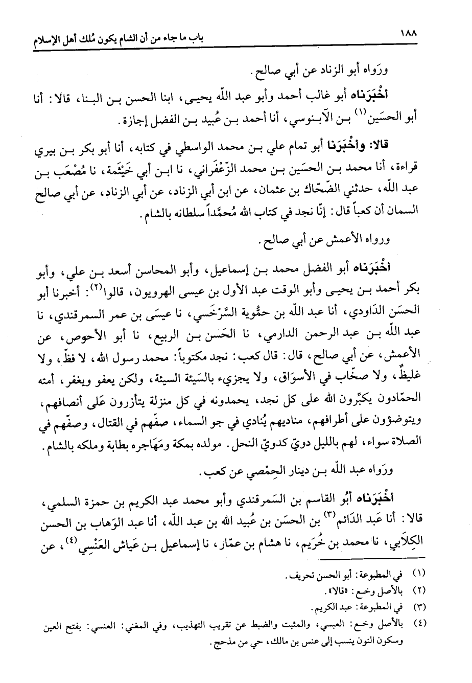 ورواه أبو الزناد عن أبي صالح أخبرناه أبو غالب أحمد وأبو عبد الله يحيى ابنا الحسن بن البنا قالا أنا أبو الحسين (1) بن الآبنوسي أنا أحمد بن عبيد بن الفضل إجازة قالا وأخبرنا أبو تمام علي بن محمد الواسطي في كتابه أنا أبو بكر بن بيري قراءة أنا محمد بن الحسين بن محمد الزعفراني نا ابن أبي خيثمة نا مصعب بن عبد الله حدثني الضحاك بن عثمان عن ابن أبي الزناد عن أبي الزناد عن أبي صالح السمان أن كعبا قال إنا نجد في كتاب الله محمدا سلطانه بالشام ورواه الأعمش عن ابي صالح أخبرناه أبو الفضل محمد بن إسماعيل وأبو المحاسن أسعد بن علي وأبو بكر أحمد بن يحيى وأبو الوقت عبد الأول بن عيسى الهرويون قالوا (2) أخبرنا أبو الحسن الداودي أنا عبد الله بن حموية السرخسي نا عيسى بن عمر السمرقندي نا عبد الله بن عبد الرحمن الدارمي نا الحسن بن الربيع نا أبو الأحوص عن الأعمش عن أبي صالح قال قال كعب نجد مكتوبا محمد رسول الله لا فظ ولا غليظ ولا صخاب في الأسواق ولا يجزئ بالسيئة السيئة ولكن يعفو ويغفر أمته الحمادون يكبرون الله على كل نجد يحمدونه في كل منزلة يتأزرون على أنصافهم ويتوضؤون على أطرافهم مناديهم ينادي في جو السماء صفهم في القتال وصفهم في الصلاة سواء لهم بالليل دوي كدوي النحل مولده بمكة ومهاجره بطابة وملكه بالشام ورواه عبد الله بن دينار الحمصي عن كعب أخبرناه أبو القاسم بن السمرقندي وأبو محمد عبد الكريم بن حمزة السلمي قالا أنا عبد الدائم (3) بن الحسن بن عبيد الله بن عبد الله أنا عبد الوهاب بن الحسن الكلابي نا محمد بن خريم نا هشام بن عمار نا إسماعيل بن عياش العنسي (4) عن