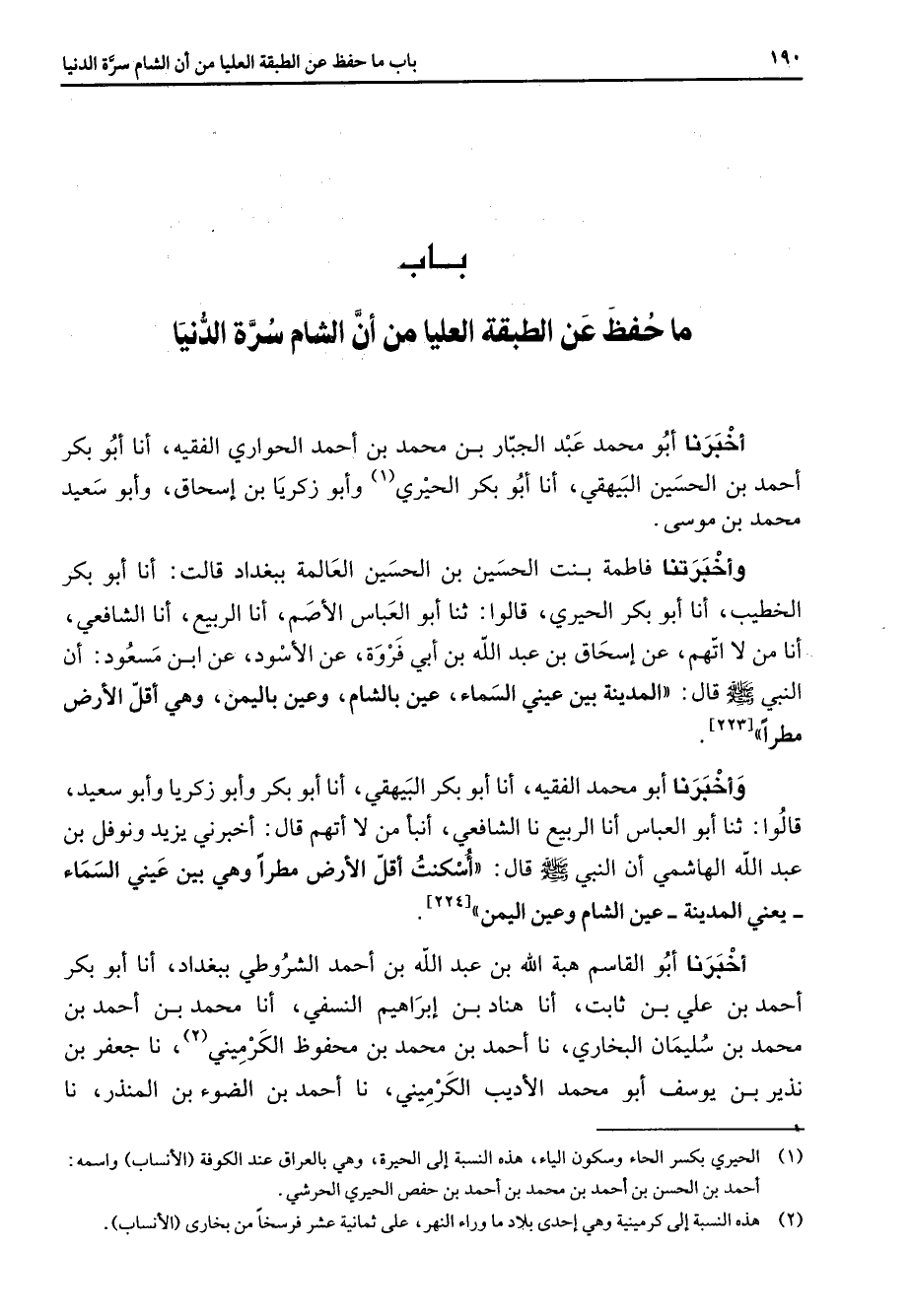 باب ما حفظ عن الطبقة العليا من أن الشام سرة الدنيا " أخبرنا أبو محمد عبد الجبار بن محمد بن أحمد الحواري الفقيه أنا أبو بكر أحمد الحسين البيهقي أنا أبو بكر الحيري (1) وأبو زكريا بن إسحاق وأبو سعيد محمد بن موسى وأخبرتنا فاطمة بنت الحسين بن الحسين العالمة ببغداد قالت أنا أبو بكر الخطيب أنا أبو بكر الحيري قالوا ثنا أبو العباس الأصم أنا الربيع أنا الشافعي أنا من لا أتهم عن إسحاق بن عبد الله بن أبي فروة عن الأسود عن ابن مسعود أن النبي (صلى الله عليه وسلم) قال المدينة بين عيني السماء عين بالشام وعين باليمن وهي أقل الأرض مطرا وأخبرنا أبو محمد الفقيه أنا أبو بكر البيهقي أنا أبو بكر وأبو زكريا وأبو سعيد قالوا ثنا أبو العباس أنا الربيع نا الشافعي أنبأ من لا أتهم قال أخبرني يزيد ونوفل بن عبد الله الهاشمي أن النبي (صلى الله عليه وسلم) قال أسكنت أقل الأرض مطرا وهي بين عيني السماء يعني المدينة عين الشام وعين اليمن أخبرنا أبو القاسم هبة الله بن عبد الله بن أحمد الشروطي ببغداد أنا أبو بكر أحمد بن علي بن ثابت أنا هناد بن إبراهيم النسفي أنا محمد بن أحمد بن محمد بن سليمان البخاري نا أحمد بن محمد بن محفوظ الكرميني (2) نا جعفر بن نذير بن يوسف أبو محمد الأديب الكرميني نا أحمد بن الضوء بن المنذر نا