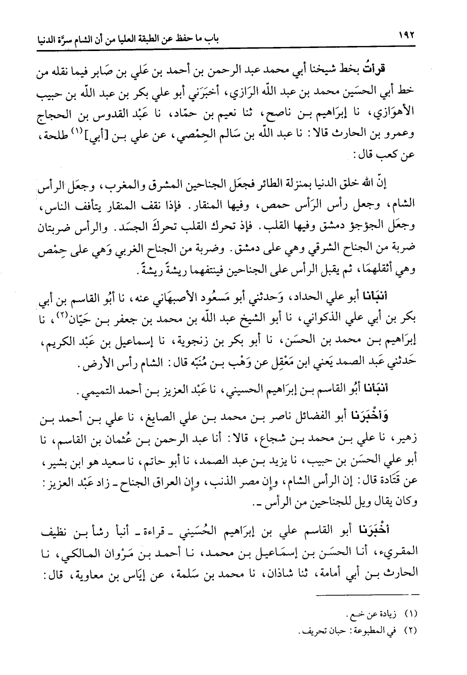 قرأت بخط شيخنا أبي محمد عبد الرحمن بن أحمد بن علي بن صابر فيما نقله من خط أبي الحسين محمد بن عبد الله الرازي أخبرني أبو علي بكر بن عبد الله بن حبيب الأهوازي نا إبراهيم بن ناصح ثنا نعيم بن حماد نا عبد القدوس بن الحجاج وعمرو بن الحارث قالا نا عبد الله بن سالم الحمصي عن علي بن أبي طلحة (1) عن كعب قال إن الله خلق الدنيا بمنزلة الطائر فجعل الجناحين المشرق والمغرب وجعل الرأس الشام وجعل رأس الرأس حمص وفيها المنقار فإذا نقف المنقار يتأفف الناس وجعل الجؤجؤ دمشق وفيها القلب فإذ تحرك القلب تحرك الجسد والرأس ضربتان ضربة من الجناح الشرقي وهي على دمشق وضربة من الجناح الغربي وهي على حمص وهي أثقلهما ثم يقبل الرأس على الجناحين فينتفهما ريشة ريشة أنبأنا أبو علي الحداد وحدثني أبو مسعود الاصبهاني عنه نا أبو القاسم بن أبي بكر بن أبي علي الذكواني نا أبو الشيخ عبد الله بن محمد بن جعفر بن حيان (2) نا إبراهيم بن محمد بن الحسن نا أبو بكر بن زنجوية نا إسماعيل بن عبد الكريم حدثني عبد الصمد يعني ابن معقل عن وهب بن منبه قال الشام رأس الأرض أنبأنا أبو القاسم بن إبراهيم الحسيني نا عبد العزيز بن أحمد التميمي وأخبرنا أبو الفضائل ناصر بن محمد بن علي الصايغ نا علي بن أحمد بن زهير نا علي بن محمد بن شجاع قالا أنا عبد الرحمن بن عثمان بن القاسم نا أبو علي الحسن بن حبيب نا يزيد بن عبد الصمد نا أبو حاتم نا سعيد هو ابن بشير عن قتادة قال إن الرأس الشام وإن مصر الذنب وإن العراق الجناح زاد عبد العزيز وكان يقال ويل للجناحين من الرأس أخبرنا أبو القاسم علي بن إبراهيم الحسيني قراءة أنبأ رشأ بن نظيف المقرئ أنا الحسن بن إسماعيل بن محمد نا أحمد بن مروان المالكي نا الحارث بن أبي أمامة ثنا شاذان نا محمد بن سلمة عن إياس بن معاوية قال