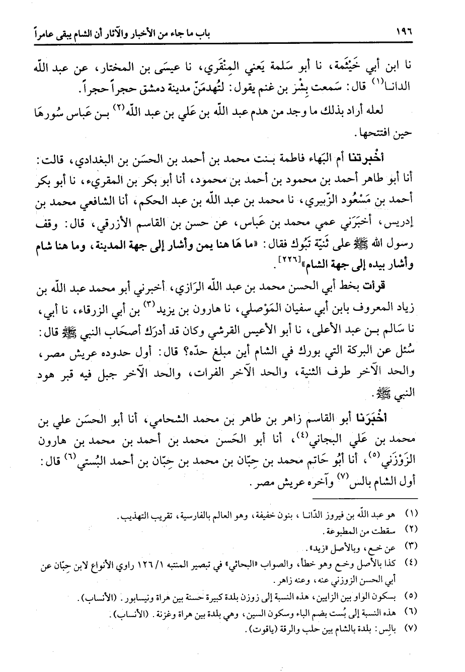 نا ابن أبي خيثمة نا أبو سلمة يعني المنقري نا عيسى بن المختار عن عبد الله الدانا (1) قال سمعت بشر بن غنم يقول لتهدمن مدينة دمشق حجرا حجرا لعله أراد بذلك ما وجد من هدم عبد الله بن علي بن عبد الله (2) بن عباس سورها حين افتتحها أخبرتنا أم البهاء فاطمة بنت محمد بن أحمد بن الحسن بن البغدادي قالت أنا أبو طاهر أحمد بن محمود بن أحمد بن محمود أنا أبو بكر بن المقرئ نا أبو بكر أحمد بن مسعود الزبيري نا محمد بن عبد الله بن عبد الحكم أنا الشافعي محمد بن إدريس أخبرني عمي محمد بن عباس عن حسن بن القاسم الأزرقي قال وقف رسول الله (صلى الله عليه وسلم) على ثنية تبوك فقال ما ها هنا يمن وأشار إلى جهة المدينة وما هنا شام وأشار بيده إلى جهة الشام قرأت بخط أبي الحسن محمد بن عبد الله الرازي أخبرني أبو محمد عبد الله بن زياد المعروف بابن أبي سفيان الموصلي نا هارون بن يزيد (3) بن أبي الزرقاء نا أبي نا سالم بن عبد الأعلى نا أبو الأعيس القرشي وكان قد أدرك أصحاب النبي (صلى الله عليه وسلم) قال سئل عن البركة التي بورك في الشام أين مبلغ حده قال أول حدوده عريش مصر والحد الآخر طرف الثنية والحد الآخر الفرات والحد الآخر جبل فيه قبر هود النبي (صلى الله عليه وسلم) أخبرنا أبو القاسم زاهر بن طاهر بن محمد الشحامي أنا أبو الحسن علي بن محمد بن علي البجاني (4) أنا أبو الحسن محمد بن أحمد بن محمد بن هارون الزوزني (5) أنا أبو حاتم محمد بن حبان بن محمد بن حبان بن أحمد البستي (6) قال أول الشام بالس (7) وآخره عريش مصر "