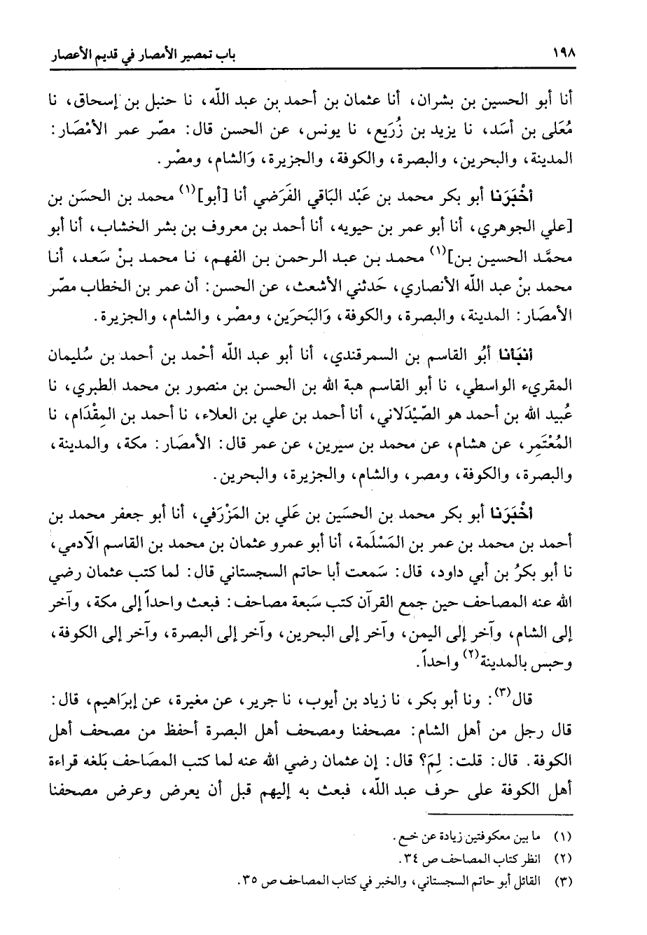 أنا أبو الحسين بن بشران أنا عثمان بن أحمد بن عبد الله نا حنبل بن إسحاق نا معلى بن أسد نا يزيد بن زريع نا يونس عن الحسن قال مصر عمر الأمصار المدينة والبحرين والبصرة والكوفة والجزيرة والشام ومصر أخبرنا أبو بكر محمد بن عبد الباقي الفرضي أنا أبو (1) محمد بن الحسن بن علي الجوهري أنا أبو عمر بن حيوية أنا أحمد بن معروف بن بشر الخشاب أنا أبو محمد الحسين بن (1) محمد بن عبد الرحمن بن الفهم نا محمد بن سعد أنا محمد بن عبد الله الأنصاري حدثني الأشعث عن الحسن أن عمر بن الخطاب مصر الأمصار المدينة والبصرة والكوفة والبحرين ومصر والشام والجزيرة أنبأنا أبو القاسم بن السمرقندي أنا أبو عبد الله أحمد بن أحمد بن سليمان المقرئ الواسطي نا أبو القاسم هبة الله بن الحسن بن منصور بن محمد الطبري نا عبيد الله بن أحمد هو الصيدلاني أنا أحمد بن علي بن العلاء نا أحمد بن المقدام نا المعتمر عن هشام عن محمد بن سيرين عن عمر قال الأمصار مكة والمدينة والبصرة والكوفة ومصر والشام والجزيرة والبحرين أخبرنا أبو بكر محمد بن الحسين بن علي بن المزرفي أنا أبو جعفر محمد بن أحمد بن محمد بن عمر بن المسلمة أنا أبو عمرو عثمان بن محمد بن القاسم الآدمي نا أبو بكر بن أبي داود قال سمعت أبا حاتم السجستاني قال لما كتب عثمان Bهـ المصاحف حين جمع القرآن كتب سبعة مصاحف فبعث واحدا إلى مكة وآخر إلى الشام وآخر إلى اليمن وآخر إلى البحرين وآخر إلى البصرة وآخر إلى الكوفة وحبس بالمدينة (2) واحدا قال (3) ونا أبو بكر نا زياد بن أيوب نا جرير عن مغيرة عن إبراهيم قال قال رجل من أهل الشام مصحفنا ومصحف أهل البصرة أحفظ من مصحف أهل الكوفة قال قلت لم قال إن عثمان Bهـ لما كتب المصاحف بلغه قراءة أهل الكوفة على حرف عبد الله فبعث به إليهم قبل أن يعرض وعرض مصحفنا