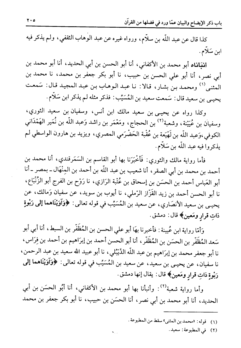 كذا قال عن عبد الله بن سلام ورواه غيره عن عبد الوهاب الثقفي ولم يذكر فيه ابن سلام أنبأناه أبو محمد بن الأكفاني أنا أبو الحسن بن أبي الحديد أنا أبو محمد بن أبي نصر أنا أبو علي الحسن بن حبيب نا أبو بكر جعفر بن محمد نا محمد بن المثنى (1) ومحمد بن بشار قالا نا عبد الوهاب بن عبد المجيد قال سمعت يحيى بن سعيد قال سمعت سعيد بن المسيب فذكر مثله لم يذكر ابن سلام وكذا رواه عن يحيى بن سعيد مالك ابن أنس وسفيان بن سعيد الثوري وسفيان بن عيينة وشعبة (2) بن الحجاج ومعمر بن راشد وعبد الله بن نمير الهمداني الكوفي وعبد الله بن لهيعة بن عقبة الحضرمي المصري ويزيد بن هارون الواسطي لم يذكروا فيه عبد الله بن سلام فأما رواية مالك والثوري فأخبرنا بها أبو القاسم بن السمرقندي أنا محمد بن أحمد بن محمد بن أبي الصقر أنا شعيب بن عبد الله بن أحمد بن المنهال بمصر أنا أبو العباس أحمد بن الحسن بن إسحاق بن عتبة الرازي نا روح بن الفرج أبو الزنباع نا أبو الحسن أحمد بن زيد القزاز الرملي نا أيوب بن سويد عن سفيان ومالك عن يحيى بن سعيد الأنصاري عن سعيد بن المسيب في قوله تعالى " وآويناهما إلى ربوة ذات قرار ومعين " قال دمشق وأما رواية ابن عيينة فأخبرنا بها أبو علي الحسن بن المظفر بن السبط أنا أبي أبو سعد المظفر بن الحسن بن المظفر أنا أبو الحسن أحمد بن إبراهيم بن أحمد بن فراس نا أبو جعفر محمد بن إبراهيم بن عبد الله الديبلي نا أبو عبيد الله سعيد بن عبد الرحمن نا سفيان عن يحيى بن سعيد عن سعيد بن المسيب في قوله تعالى " وآويناهما إلى ربوة ذات قرار ومعين " قال يقال إنها دمشق وأما رواية شعبة (2) وأنبأنا بها أبو محمد بن الأكفاني أنا أبو الحسن بن أبي الحديد أنا أبو محمد بن أبي نصر أنا الحسن بن حبيب نا أبو بكر جعفر بن محمد