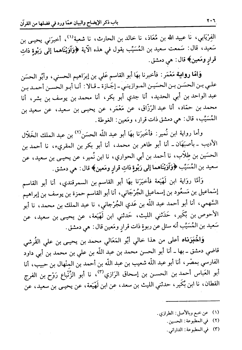 الفريابي نا عبيد الله بن معاذ نا خالد بن الحارث نا شعبة (1) أخبرني يحيى بن سعيد قال سمعت سعيد بن المسيب يقول في هذه الآية " وآويناهما إلى ربوة ذات قرار ومعين " قال هي دمشق وأما رواية معمر فأخبرنا بها أبو القاسم علي بن إبراهيم الحسني وأبو الحسن علي بن الحسن بن الحسين الموازيني إجازة قالا أنا أبو الحسن أحمد بن عبد الواحد بن أبي الحديد أنا جدي أبو بكر أنا محمد بن يوسف بن بشر أنا محمد بن حماد أنا عبد الرزاق عن معمر عن يحيى بن سعيد عن سعيد بن المسيب قال هي دمشق ذات قرار ومعين الغوطة وأما رواية ابن نمير فأخبرنا بها أبو عبد الله الحسن (2) بن عبد الملك الخلال الأديب بأصبهان أنا أبو طاهر بن محمد أنا أبو بكر بن المقرئ نا أحمد بن الحسين بن طلاب نا أحمد بن أبي الحواري نا ابن نمير عن يحيى بن سعيد عن سعيد بن المسيب " وآويناهما إلى ربوة ذات قرار ومعين " قال هي دمشق وأما رواية ابن لهيعة فأخبرنا بها أبو القاسم بن السمرقندي أنا أبو القاسم إسماعيل بن مسعود بن إسماعيل الجرجاني أنا أبو القاسم حمزة بن يوسف بن إبراهيم السهمي أنا أبو أحمد عبد الله بن عدي الجرجاني نا عبد الملك بن محمد نا أبو الأحوص بن بكير حدثني الليث حدثني ابن لهيعة عن يحيى بن سعيد عن سعيد بن المسيب أنه سئل عن ربوة ذات قرار ومعين قال هي دمشق وأخبرناه أعلى من هذا خالي أبو المعالي محمد بن يحيى بن علي القرشي قاضي دمشق بها أنا أبو الحسن محمد بن عبد الله بن علي بن محمد بن أبي داود الفارسي بمصر أنا أبو عبد الله شعيب بن عبد الله بن أحمد بن المنهال بن حبيب أنا أبو العباس أحمد بن الحسن بن إسحاق الرازي (3) نا أبو الزنباع روح بن الفرج القطان نا ابن بكير حدثني الليث بن سعد عن ابن لهيعة عن يحيى بن سعيد عن