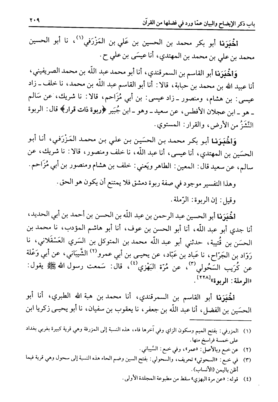 أخبرنا أبو بكر محمد بن الحسين بن علي بن المزرفي (1) نا أبو الحسين محمد بن علي بن محمد بن المهتدي أنا عيسى بن علي وأخبرنا أبو القاسم بن السمرقندي أنا أبو محمد عبد الله بن محمد الصريفيني أنا عبيد الله بن محمد بن حبابة قالا أنا أبو القاسم عبد الله بن محمد نا خلف زاد عيسى بن هشام ومنصور زاد عيسى بن أبي مزاحم قالا نا شريك عن سالم هو ابن عجلان الأفطس عن سعيد وهو ابن جبير " ربوة ذات قرار " قال الربوة النشز من الأرض والقرار المستوي وأخبرنا أبو بكر محمد بن الحسين بن علي بن محمد المزرفي أنا أبو الحسين بن المهتدي أنا عيسى أنا عبد الله نا خلف ومنصور قالا نا شريك عن سالم عن سعيد قال المعين الطاهر ويعني خلف بن هشام ومنصور بن أبي مزاحم وهذا التفسير موجود في صفة ربوة دمشق فلا يمتنع أن يكون هو الحق وقيل إن الربوة الرملة أخبرنا أبو الحسين عبد الرحمن بن عبد الله بن الحسن بن أحمد بن أبي الحديد أنا جدي أبو عبد الله أنا أبو الحسن بن عوف أنا أبو هاشم المؤدب نا محمد بن الحسن بن قتيبة حدثني أبو عبد الله محمد بن المتوكل بن السري العسقلاني نا رواد بن الجراح نا عباد بن عباد عن يحيى بن أبي عمرو (2) الشيباني عن أبي وعلة عن كريب السحولي (3) عن مرة البهزي (4) قال سمعت رسول الله (صلى الله عليه وسلم) يقول الرملة الربوة أخبرنا أبو القاسم بن السمرقندي أنا محمد بن هبة الله الطبري أنا أبو الحسين بن الفضل أنا عبد الله بن جعفر نا يعقوب بن سفيان نا أبو يحيى زكريا ابن