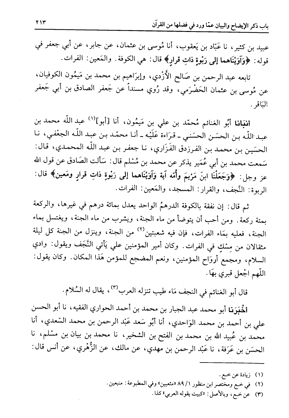 عبيد بن كثير نا عباد بن يعقوب أنا موسى بن عثمان عن جابر عن ابي جعفر في قوله " وآويناهمما إلى ربوة ذات قرار " قال هي الكوفة والمعين الفرات تابعه عبد الرحمن بن صالح الأزدي وإبراهيم بن محمد بن ميمون الكوفيان عن موسى بن عثمان الحضرمي وقد روي مسندا عن جعفر الصادق بن أبي جعفر الباقر أنبأنا أبو الغنائم محمد بن علي بن ميمون أنا أبو (1) عبد الله محمد بن عبد الله بن الحسن الحسني قراءة عليه أنا محمد بن عبد الله الجعفي نا الحسين بن محمد بن الفرزدق الفزاري نا جعفر بن عبد الله المحمدي قال سمعت محمد بن أبي عمير يذكر عن محمد بن مسلم قال سألت الصادق عن قول الله عز وجل " وجعلنا ابن مريم وأمه آية وآويناهما إلى ربوة ذات قرار ومعين " قال الربوة النجف والقرار المسجد والمعين الفرات ثم قال إن نفقة بالكوفة الدرهم الواحد يعدل بمائة درهم في غيرها والركعة بمئة ركعة ومن أحب أن يتوضأ من ماء الجنة ويشرب من ماء الجنة ويغتسل بماء الجنة فعليه بماء الفرات فإن فيه شعبتين (2) من الجنة وينزل من الجنة كل ليلة مثقالان من مسك في الفرات وكان أمير المؤمنين علي يأتي النجف ويقول وادي السلام ومجمع أرواح المؤمنين ونعم المضجع للمؤمن هذا المكان وكان يقول اللهم اجعل قبري بها قال أبو الغنائم في النجف ماء طيب تنزله العرب (3) يقال له السلام أخبرنا أبو محمد عبد الجبار بن محمد بن أحمد الحواري الفقيه نا أبو الحسن علي بن أحمد بن محمد الواحدي أنا أبو سعد عبد الرحمن بن محمد السعدي أنا محمد بن عبيد الله بن محمد بن الفتح بن الشخير نا محمد بن بيان بن مسلم نا الحسن بن عرفة نا عبد الرحمن بن مهدي عن مالك عن الزهري عن أنس قال