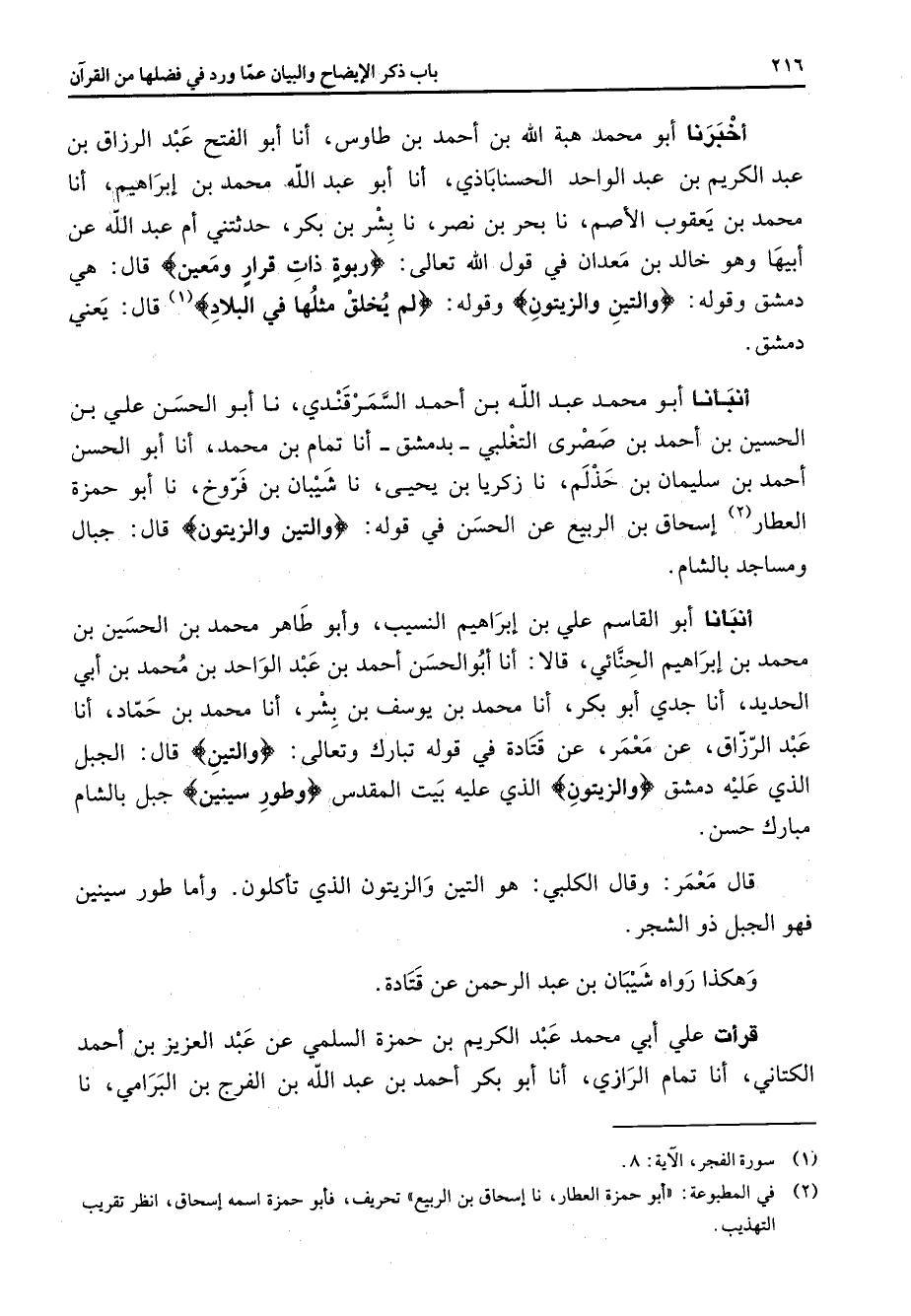 أخبرنا أبو محمد هبة الله بن أحمد بن طاوس أنا أبو الفتح عبد الرزاق بن عبد الكريم بن عبد الواحد الحسناباذي أنا أبو عبد الله محمد بن إبراهيم أنا محمد بن يعقوب الأصم نا بحر بن نصر نا بشر بن بكر حدثتني أم عبد الله عن أبيها وهو خالد بن معدان في قول الله تعالى " ربوة ذات قرار ومعين " قال هي دمشق وقوله " والتين والزيتون " وقوله " لم يخلق مثلها في البلاد " (1) قال يعني دمشق أنبأنا أبو محمد عبد الله بن أحمد السمرقندي نا أبو الحسن علي بن الحسين بن أحمد بن صصري التغلبي بدمشق أنا تمام بن محمد أنا أبو الحسن أحمد بن سليمان بن حذلم نا زكريا بن يحيى نا شيبان بن فروخ نا أبو حمزة العطار (2) إسحاق بن الربيع عن الحسن في قوله " والتين والزيتون " قال جبال ومساجد بالشام أنبأنا أبو القاسم علي بن إبراهيم النسيب وأبو طاهر محمد بن الحسين بن محمد بن إبراهيم الحنائي قالا أنا أبو الحسن أحمد بن عبد الواحد بن محمد بن أبي الحديد أنا جدي أبو بكر أنا محمد بن يوسف بن بشر أنا محمد بن حماد أنا عبد الرزاق عن معمر عن قتادة في قوله تبارك وتعالى " والتين " قال الجبل الذي عليه دمشق " والزيتون " الذي عليه بيت المقدس " وطور سينين " جبل بالشام مبارك حسن قال معمر وقال الكلبي هو التين والزيتون الذي تأكلون وأما طور سينين فهو الجبل ذو الشجر وهكذا رواه شيبان بن عبد الرحمن عن قتادة قرأت على ابي محمد عبد الكريم بن حمزة السلمي عن عبد العزيز بن أحمد الكتاني أنا تمام الرازي أنا أبو بكر أحمد بن عبد الله بن الفرج بن البرامي نا