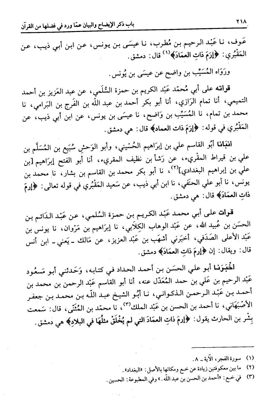 عوف نا عبد الرحيم بن مطرب نا عيسى بن يونس عن ابن أبي ذيب عن المقبري " إرم ذات العماد " (1) قال دمشق ورواه المسيب بن واضح عن عيسى بن يونس قرأته على أبي محمد عبد الكريم بن حمزة السلمي عن عبد العزيز بن أحمد التميمي أنا تمام الرازي أنا أبو بكر أحمد بن عبد الله بن الفرج بن البرامي نا محمد بن تمام نا المسيب بن واضح نا عيسى بن يونس عن ابن أبي ذيب عن المقبري في قوله " إرم ذات العماد " قال هي دمشق أنبأنا أبو القاسم علي بن إبراهيم الحسيني وأبو الوحش سبيع بن المسلم بن علي بن قيراط المقرئ عن رشأ بن نظيف المقرئ أنا أبو الفتح إبراهيم بن علي بن إبراهيم البغدادي (2) نا أبو بكر محمد بن القاسم بن بشار نا محمد بن يونس نا أبو علي الحنفي نا ابن أبي ذيب عن سعيد المقبري في قوله تعالى " إرم ذات العماد " قال هي دمشق قرأت على أبي محمد عبد الكريم بن حمزة السلمي عن عبد الدائم بن الحسن بن عبيد الله عن عبد الوهاب الكلابي نا إبراهيم بن مروان نا يونس بن عبد الأعلى الصدفي أخبرني أشهب بن عبد العزيز عن مالك يعني ابن أنس قال ويقال إن " إرم ذات العماد " دمشق أخبرنا أبو علي الحسن بن أحمد الحداد في كتابه وحدثني أبو مسعود عبد الرحيم بن علي بن حمد المعدل عنه أنا أبو القاسم عبد الرحمن بن محمد بن أحمد بن عبد الرحمن الذكواني نا أبو الشيخ عبد الله بن محمد بن جعفر الاصبهاني نا أحمد بن الحسن بن عبد الملك (3) نا محمد بن المثنى قال سمعت بشر بن الحارث يقول " إرم ذات العماد التي لم يخلق مثلها في البلاد " هي دمشق "