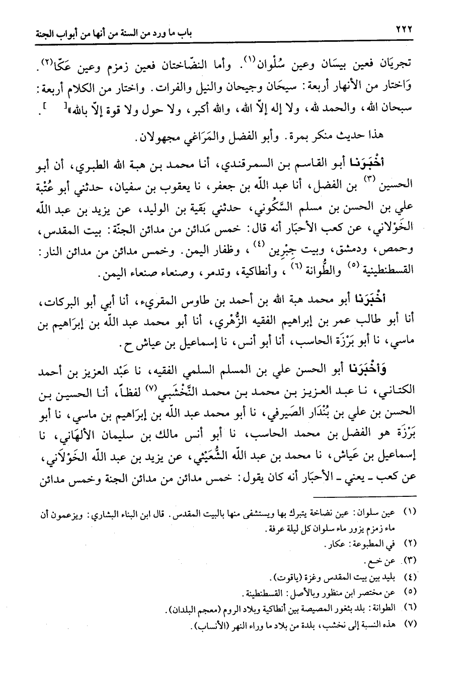 تجريان فعين بيسان وعين سلوان (1) وأما النضاختان فعين زمزم وعين عكا (2) واختار من الأنهار أربعة سيحان وجيحان والنيل والفرات واختار من الكلام أربعة سبحان الله والحمد لله ولا إله إلا الله والله أكبر ولا حول ولا قوة إلا بالله هذا حديث منكر بمرة وأبو الفضل والمراغي مجهولان أخبرنا أبو القاسم بن السمرقندي أنا محمد بن هبة الله الطبري أن أبو الحسين (3) بن الفضل أنا عبد الله بن جعفر نا يعقوب بن سفيان حدثني أبو عتبة علي بن الحسن بن مسلم السكوني حدثني بقية بن الوليد عن يزيد بن عبد الله الخولاني عن كعب الأحبار أنه قال خمس مدائن من مدائن الجنة بيت المقدس وحمص ودمشق وبيت جبرين (4) وظفار اليمن وخمس مدائن من مدائن النار القسطنطينية (5) والطوانة (6) وأنطاكية وتدمر وصنعاء صنعاء اليمن أخبرنا أبو محمد هبة الله بن أحمد بن طاوس المقرئ أنا أبي أبو البركات أنا أبو طالب عمر بن إبراهيم الفقيه الزهري أنا أبو محمد عبد الله بن إبراهيم بن ماسي نا أبو برزة الحاسب أنا أبو أنس نا إسماعيل بن عياش وأخبرنا أبو الحسن علي بن المسلم السلمي الفقيه نا عبد العزيز بن أحمد الكتاني نا عبد العزيز بن محمد بن محمد النخشبي (7) لفظا أنا الحسين بن الحسن بن علي بن بندار الصيرفي نا أبو محمد عبد الله بن إبراهيم بن ماسي نا أبو برزة هو الفضل بن محمد الحاسب نا أبو أنس مالك بن سليمان الألهاني نا إسماعيل بن عياش نا محمد بن عبد الله الشعيثي عن يزيد بن عبد الله الخولاني عن كعب يعني الأحبار أنه كان يقول خمس مدائن من مدائن الجنة وخمس مدائن