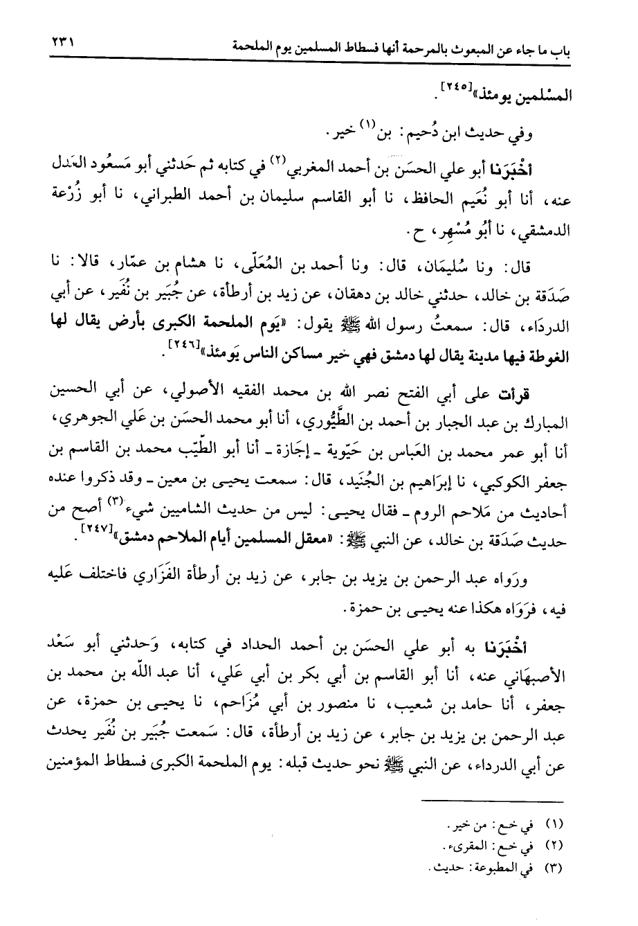المسلمين يومئذ وفي حديث ابن دحيم بن (1) خير أخبرنا أبو علي الحسن بن أحمد المغربي (2) في كتابه ثم حدثني أبو مسعود العدل عنه أنا أبو نعيم الحافظ نا أبو القاسم بن أحمد الطبراني نا أبو زرعة الدمشقي نا أبو مسهر قال ونا سليمان قال ونا أحمد بن المعلى نا هشام بن عمار قالا نا صدقة بن خالد حدثني خالد بن دهقان عن زيد بن أرطأة عن جبير بن نفير عن أبي الدرداء قال سمعت رسول الله (صلى الله عليه وسلم) يقول يوم الملحمة الكبرى بأرض يقال لها الغوطة فيها مدينة يقال لها دمشق فهي خير مساكن الناس يومئذ قرأت على ابي الفتح نصر الله بن محمد الفقيه الأصولي عن أبي الحسين المبارك بن عبد الجبار بن أحمد بن الطيوري أنا أبو محمد الحسن بن علي الجوهري أنا أبو عمر محمد بن العباس بن حيوية إجازة أنا أبو الطيب محمد بن القاسم بن جعفر الكوكبي نا إبراهيم بن الجنيد قال سمعت يحيى بن معين وقد ذكروا عنده أحاديث من ملاحم الروم فقال يحيى ليس من حديث الشاميين شئ (3) أصح من حديث صدقة بن خالد عن النبي (صلى الله عليه وسلم) معقل المسلمين أيام الملاحم دمشق ورواه عبد الرحمن بن يزيد بن جابر عن زيد بن أرطأة الفزاري فاختلف عليه فيه فرواه هكذا عنه يحيى بن حمزة أخبرنا به أبو علي الحسن بن أحمد الحداد في كتابه وحدثني أبو سعد الاصبهاني عنه أنا أبو القاسم بن أبي بكر بن أبي علي أنا عبد الله بن محمد بن جعفر أنا حامد بن شعيب نا منصور بن أبي مزاحم نا يحيى بن حمزة عن عبد الرحمن بن يزيد بن جابر عن زيد بن أرطأة قال سمعت جبير بن نفير يحدث عن أبي الدرداء عن النبي (صلى الله عليه وسلم) نحو حديث قبله يوم الملحمة الكبرى فسطاط المؤمنين