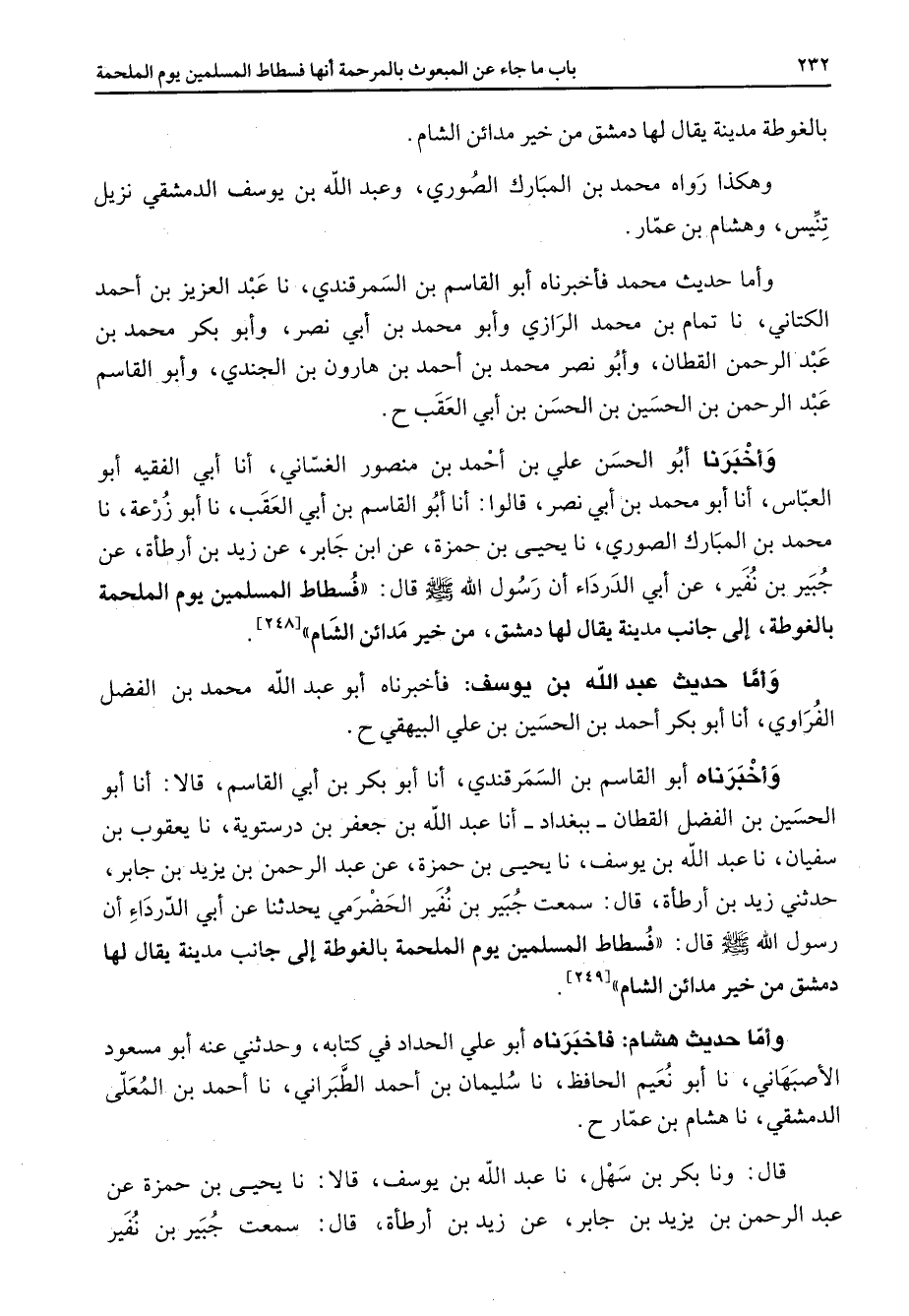بالغوطة مدينة يقال لها دمشق من خير مدائن الشام وهكذا رواه محمد بن المبارك الصوري وعبد الله بن يوسف الدمشقي نزيل تنيس وهشام بن عمار وأما حديث محمد فأخبرناه أبو القاسم بن السمرقندي نا عبد العزيز بن أحمد الكتاني نا تمام بن محمد الرازي وأبو محمد بن أبي نصر وأبو بكر محمد بن عبد الرحمن القطان وأبو نصر محمد بن أحمد بن هارون بن الجندي وأبو القاسم عبد الرحمن بن الحسين بن الحسن بن أبي العقب وأخبرنا أبو الحسن علي بن أحمد بن منصور الغساني أنا أبي الفقيه أبو العباس أنا أبو محمد بن ابي نصر قالوا أنا أبو القاسم بن أبي العقب نا أبو زرعة نا محمد بن المبارك الصوري نا يحيى بن حمزة عن ابن جابر عن زيد بن أرطأة عن جبير بن نفير عن أبي الدرداء أن رسول الله (صلى الله عليه وسلم) قال فسطاط المسلمين يوم الملحمة بالغوطة إلى جانب مدينة يقال لها دمشق من خير مدائن الشام وأما حديث عبد الله بن يوسف فأخبرناه أبو عبد الله محمد بن الفضل الفراوي أنا أبو بكر أحمد بن الحسين بن علي البيهقي وأخبرناه أبو القاسم بن السمرقندي أنا أبو بكر بن ابي القاسم قالا أنا أبو الحسين بن الفضل القطان ببغداد أنا عبد الله بن جعفر بن درستوية نا يعقوب بن سفيان نا عبد الله بن يوسف نا يحيى بن حمزة عن عبد الرحمن بن يزيد بن جابر حدثني زيد بن أرطأة قال سمعت جبير بن نفير الحضرمي يحدثنا عن أبي الدرداء أن رسول الله (صلى الله عليه وسلم) قال فسطاط المسلمين يوم الملحمة بالغوطة إلى جانب مدينة يقال لها دمشق من خير مدائن الشام وأما حديث هشام فأخبرناه أبو علي الحداد في كتابه وحدثني عنه أبو مسعود الاصبهاني نا أبو نعيم الحافظ نا سليمان بن أحمد الطبراني نا أحمد بن المعلى الدمشقي نا هشام بن عمار قال ونا بكر بن سهل نا عبد الله بن يوسف قالا نا يحيى بن حمزة عن عبد الرحمن بن يزيد بن جابر عن زيد بن أرطأة قال سمعت جبير بن نفير