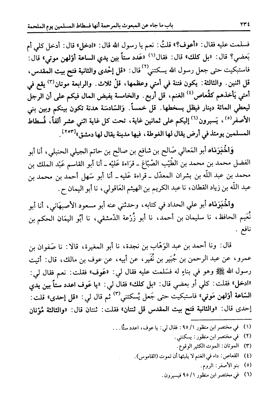 فسلمت عليه فقال أعوف قلت نعم يا رسول الله قال ادخل قال ادخل كلي أم بعضي قال بل كلك قال فقال (1) عدد ستا بين يدي الساعة أولهن موتي قال فاستبكيت حتى جعل رسول الله يسكتني (2) قال قل إحدى والثانية فتح بيت المقدس قل اثنين والثالثة يكون فتنة في أمتي وعظمها قل ثلاث والرابعة موتان (3) يقع في أمتي يأخذهم كقعاص (4) الغنم قل أربع والخامسة يفيض المال فيكم على أن الرجل ليعطي المائة دينار فيظل يسخطها قل خمسا والسادسة هدنة تكون بينكم وبين بني الأصفر (5) يسيرون (6) إليكم على ثمانين غاية تحت كل غاية اثني عشر ألفا فسطاط المسلمين يومئذ في أرض يقال لها الغوطة فيها مدينة يقال لها دمشق وأخبرناه أبو المعالي صالح بن شافع بن صالح بن حاتم الجيلي الحنبلي أنا أبو الفضل محمد بن محمد بن الطيب الصباغ قراءة عليه أنا أبو القاسم عبد الملك بن محمد بن عبد الله بن بشران المعدل قراءة عليه أنا أبو سهل أحمد بن محمد بن عبد الله بن زياد القطان نا عبد الكريم بن الهيثم العاقولي نا أبو اليمان وأخبرناه أبو علي الحداد في كتابه وحدثني عنه أبو مسعود الاصبهاني أنا أبو نعيم الحافظ نا سليمان بن أحمد نا أبو زرعة الدمشقي نا أبو اليمان الحكم بن نافع قال ونا أحمد بن عبد الوهاب بن نجدة نا أبو المغيرة قالا نا صفوان بن عمرو عن عبد الرحمن بن جبير بن نفير عن أبيه عن عوف بن مالك قال أتيت رسول الله (صلى الله عليه وسلم) وهو في بناء له فسلمت عليه فقال لي عوف فقلت نعم فقال لي ادخل فقلت كلي أو بعضي قال بل كلك فقال لي يا عوف اعدد ستا بين يدي الساعة أولهن موتي فاستبكيت حتى جعل يسكتني ثم قال لي قل إحدى قلت إحدى قال والثانية فتح بيت المقدس قل ثنتان فقلت ثنتان قال والثالثة موتان