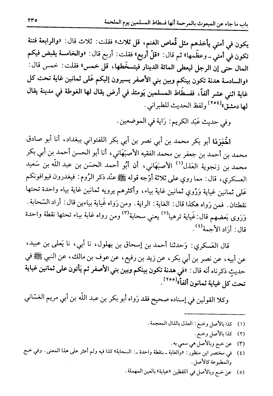 يكون في أمتي يأخذهم مثل قعاص الغنم قل ثلاث فقلت ثلاث قال والرابعة فتنة تكون في أمتي وعظمها ثم قال قل أربع فقلت أربع قال والخامسة يقبض فيكم المال حتى إن الرجل ليعطى المائة الدينار فيتسخطها قل خمس فقلت خمس قال والسادسة هدنة تكون بينكم وبين بني الأصفر يسيرون إليكم على ثمانين غاية تحت كل غاية اثني عشر ألفا ففسطاط المسلمين يومئذ في أرض يقال لها الغوطة في مدينة يقال لها دمشق ولفظ الحديث للطبراني وفي حديث عبد الكريم راية في الموضعين أخبرنا أبو بكر محمد بن أبي نصر بن أبي بكر اللفتواني ببغداد أنا أبو صادق محمد بن أحمد بن جعفر بن محمد الفقيه الاصبهاني أنا أبو الحسن أحمد بن ابي بكر محمد بن زنجوية العذل (1) الاصبهاني أن أبو أحمد الحسن بن عبد الله بن سعيد العسكري قال مما روي على ثلاثة أوجه قوله (صلى الله عليه وسلم) عند ذكر الروم فيغدرون فيوافونكم على ثمانين غياية وروي ثمانين غاية بياء وأكثرهم يرويه ثمانين غاية بياء واحدة تحتها نقطتان فمن رواه هكذا قال الغاية الراية ومن رواه غياية بياءين قال أراد السحابة وروى بعضهم قال غياية ترهيا (2) يعني سحابة (3) ومن رواه غابة بباء تحتها نقطة واحدة قال أراد الأجمة (4) قال العسكري وحدثنا أحمد بن إسحاق بن بهلول نا أبي نا يعلى بن عبيد عن أبيه عن نصر بن أبي بكر عن زيد بن رفيع عن عوف بن مالك عن النبي (صلى الله عليه وسلم) في حديث ذكرناه أنه قال في هدنة تكون بينكم وبين بني الأصفر ثم يأتون على ثمانين غياية تحت كل غياية ثمانون ألفا وكلا القولين في إسناده صحيح فقد رواه أبو بكر بن عبد الله بن أبي مريم الغساني