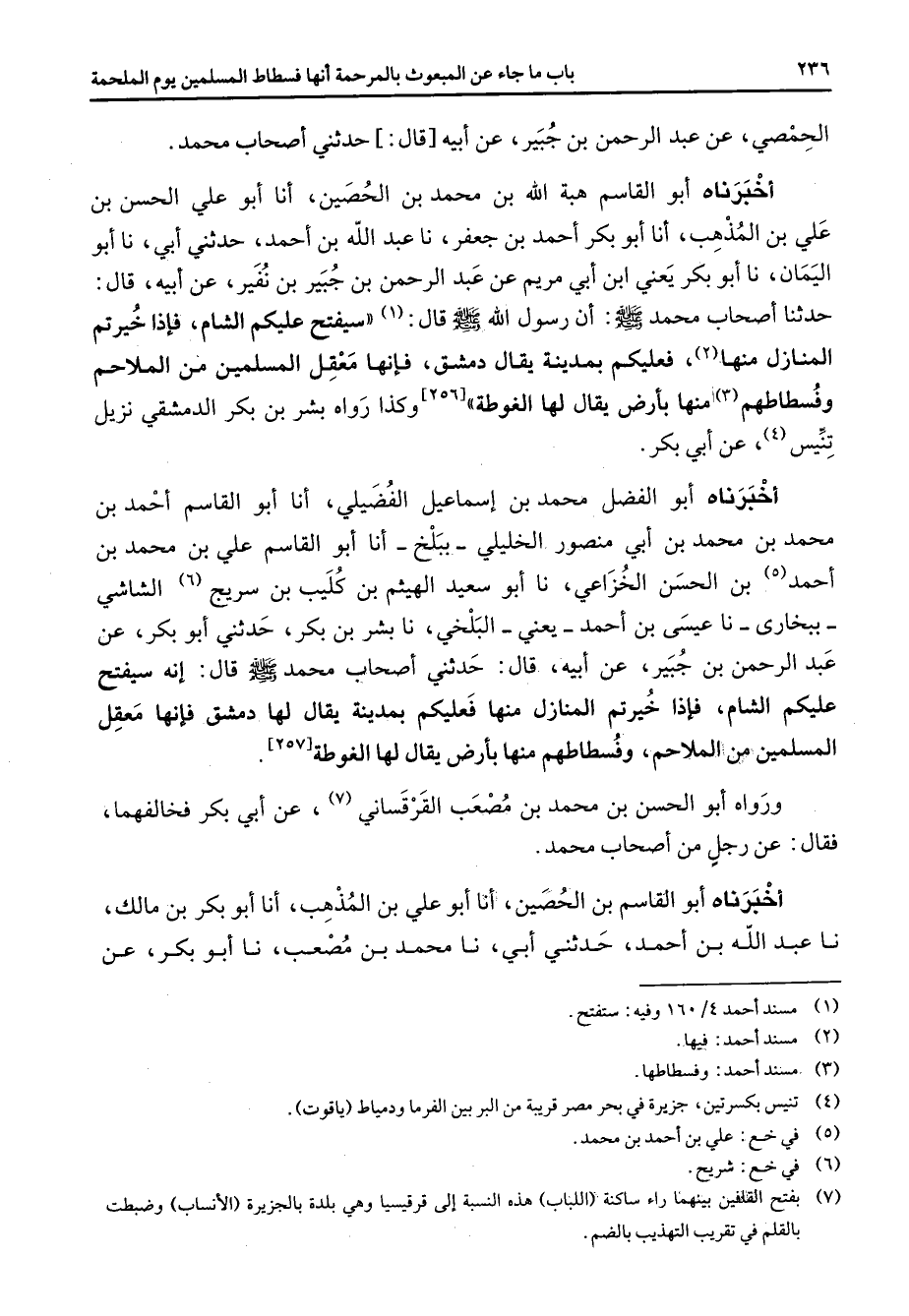 الحمصي عن عبد الرحمن بن جبير عن أبيه قال حدثني أصحاب محمد أخبرناه أبو القاسم هبة الله بن محمد بن الحصين أنا أبو علي الحسن بن علي بن المذهب أنا أبو بكر أحمد بن جعفر نا عبد الله بن أحمد حدثني أبي نا أبو اليمان نا أبو بكر يعني ابن أبي مريم عن عبد الرحمن بن جبير بن نفير عن أبيه قال حدثنا أصحاب محمد (صلى الله عليه وسلم) أن رسول الله (صلى الله عليه وسلم) قال (1) سيفتح عليكم الشام فإذا خيرتم المنازل منها (2) فعليكم بمدينة يقال دمشق فإنها معقل المسلمين من الملاحم وفسطاطهم (3) منها بأرض يقال لها الغوطة وكذا رواه بشر بن بكر الدمشقي نزيل تنيس (4) عن أبي بكر أخبرناه أبو الفضل محمد بن إسماعيل الفضيلي أنا أبو القاسم أحمد بن محمد بن محمد بن أبي منصور الخليلي ببلخ أنا أبو القاسم علي بن محمد بن أحمد (5) بن الحسن الخزاعي نا أبو سعيد الهيثم بن كليب بن سريج (6) الشاشي ببخارى نا عيسى بن أحمد يعني البلخي نا بشر بن بكر حدثني أبو بكر عن عبد الرحمن بن جبير عن أبيه قال حدثني أصحاب محمد (صلى الله عليه وسلم) قال إنه سيفتح عليكم الشام فإذا خيرتم المنازل منها فعليكم بمدينة يقال لها دمشق فإنها معقل المسلمين من الملاحم وفسطاطهم منها بأرض يقال لها الغوطة ورواه أبو الحسن بن محمد بن مصعب القرقساني (7) عن ابي بكر فخالفهما فقال عن رجل من أصحاب محمد أخبرناه أبو القاسم بن الحصين أنا أبو علي بن المذهب أنا أبو بكر بن مالك نا عبد الله بن أحمد حدثني أبي نا محمد بن مصعب نا أبو بكر عن