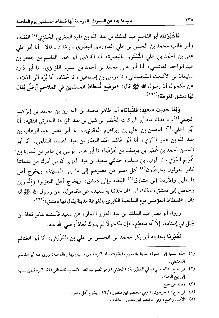 فأخبرناه أبو القاسم عبد الملك بن عبد الله بن داود المغربي الحمزي (1) الفقيه وأبو غالب محمد بن الحسن بن علي الماوردي البصري ببغداد قالا أنا أبو علي علي بن أحمد بن علي التستري بالبصرة أنا القاضي أبو عمر القاسم بن جعفر بن عبد الواحد الهاشمي أنا أبو علي محمد بن أحمد بن عمرو اللؤلؤي نا أبو داود سليمان بن الاشعث السجستاني نا موسى بن إسماعيل نا حماد أنا برد بن أبو العلاء عن مكحول أن رسول الله (صلى الله عليه وسلم) قال موضع فسطاط المسلمين في الملاحم أرض يقال لها دمشق الغوطة وأما حديث سعيد فأنبأناه أبو طاهر محمد بن الحسين بن محمد بن إبراهيم الجيلي (2) وحدثنا عنه أبو البركات الخضر بن شبل بن عبد الواحد الحارثي الفقيه أنا أبو علي (3) الحسن بن علي بن إبراهيم المقرئ نا أبو نصر عبد الوهاب بن عبد الله بن عمر المري أنا أبو هاشم عبد الجبار بن عبد الصمد السلمي أنا أبو الحسن أحمد بن عمير بن يوسف بن جوصا نا أبو عامر موسى بن عامر بن عمارة بن خريم المري نا الوليد بن مسلم حدثني سعيد بن عبد العزيز أن من أدرك من علمائنا كانوا يقولون يخرصون (4) أهل مصر من مصرهم إلى ما يلي المدينة ويخرج أهل فلسطين والأردن إلى مشارق (5) البلقاء وإلى دمشق ويخرج أهل الجزيرة وقنسرين وحمص إلى دمشق وذلك لما كان حدثنا به سعيد عن مكحول عن رسول الله (صلى الله عليه وسلم) أنه قال فسطاط المؤمنين يوم الملحمة الكبرى بالغوطة مدينة يقال لها دمشق ورواه أبو نصر عبد الملك بن عبد العزيز التمار عن سعيد فأسنده بذكر معاذ بن جبل في إسناده إلا أنه منقطع فإن مكحولا لم يدرك معاذا Bهـ أخبرنا بحديثه أبو بكر محمد بن الحسين بن علي بن المزرفي أنا أبو الغنائم