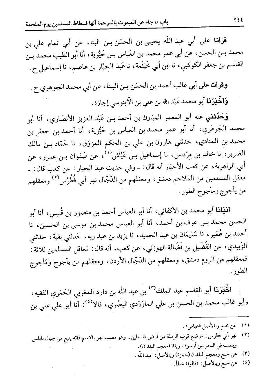 قرأنا على أبي عبد الله يحيى بن الحسن بن البنا عن أبي تمام علي بن محمد بن الحسن عن أبي عمر محمد بن العباس بن حيوية أنا أبو الطيب محمد بن القاسم بن جعفر الكوكبي نا ابن أبي خيثمة نا عبد الجبار بن عاصم نا إسماعيل وقرأت على أبي غالب أحمد بن الحسن بن البنا عن أبي محمد الجوهري وأخبرنا أبو محمد عبد الله بن علي بن الآبنوسي إجازة وحدثني عنه أبو المعمر المبارك بن أحمد بن عبد العزيز الأنصاري أنا أبو محمد الجوهري أنا أبو عمر محمد بن العباس بن حيوية أنا أحمد بن جعفر بن محمد بن المنادي حدثني هارون بن علي بن الحكم المزوق نا حماد بن مالك الضرير نا خالد بن مرداس نا إسماعيل بن عياش (1) عن صفوان بن عمرو عن أبي الزاهرية عن كعب الأحبار أنه قال وفي حديث عبد الجبار عن كعب قال معقل المسلمين من الملاحم دمشق ومعقلهم من الدجال نهر أبي فطرس (2) ومعقلهم من يأجوج ومأجوج الطور أنبأنا أبو محمد بن الأكفاني أنا أبو العباس أحمد بن منصور بن قبيس أنا أبو الحسن محمد بن عوف بن أحمد أنا أبو العباس محمد بن موسى بن الحسين نا أحمد بن عمير نا سليمان بن عبد الحميد نا يزيد بن عبد ربه حدثني بقية حدثني الزبيدي عن الفضيل بن فضالة الهوزني عن كعب أنه قال معاقل المسلمين ثلاثة فمعقلهم من الروم دمشق ومعقلهم من الدجال الأردن ومعقلهم من يأجوج ومأجوج الطور أخبرنا أبو القاسم عبد الملك (3) بن عبد الله بن داود المغربي الحمزي الفقيه وأبو غالب محمد بن الحسن بن علي الماوردي البصري قالا (4) أنا أبو علي علي بن