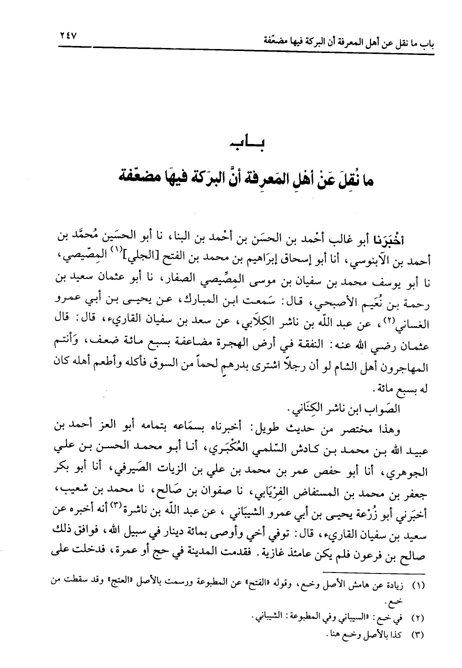 باب ما نقل عن أهل المعرفة أن البركة فيها مضعفة " أخبرنا أبو غالب أحمد بن الحسن بن أحمد بن البنا نا أبو الحسين محمد بن أحمد بن الآبنوسي أنا أبو إسحاق إبراهيم بن محمد بن الفتح الجلي (1) المصيصي نا أبو يوسف محمد بن سفيان بن موسى المصيصي الصفار نا أبو عثمان سعيد بن رحمة بن نعيم الأصبحي قال سمعت ابن المبارك عن يحيى بن أبي عمرو الغساني (2) عن عبد الله بن ناشر الكلابي عن سعد بن سفيان القارئ قال قال عثمان Bهـ النفقة في أرض الهجرة مضاعفة بسبع مائة ضعف وأنتم المهاجرون أهل الشام لو أن رجلا اشترى بدرهم لحما من السوق فأكله وأطعم أهله كان له بسبع مائة الصواب ابن ناشر الكناني وهذا مختصر من حديث طويل أخبرناه بسماعه بتمامه أبو العز أحمد بن عبيد الله بن محمد بن كادش السلمي العكبري أنا أبو محمد الحسن بن علي الجوهري أنا أبو حفص عمر بن محمد بن علي بن الزيات الصيرفي أنا أبو بكر جعفر بن محمد بن المستفاض الفريابي نا صفوان بن صالح نا محمد بن شعيب أخبرني أبو زرعة يحيى بن أبي عمرو الشيباني عن عبد الله بن ناشرة (3) أنه أخبره عن سعيد بن سفيان القارئ قال توفي أخي وأوصى بمائة دينار في سبيل الله فوافق ذلك صالح بن فرعون فلم يكن عامئذ غازية فقدمت المدينة في حج أو عمرة فدخلت على