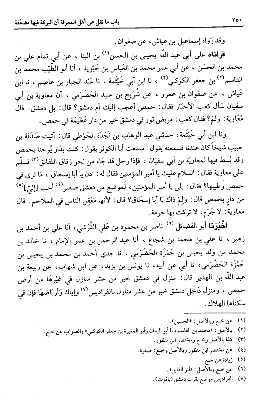 وقد رواه إسماعيل بن عياش عن صفوان قرأناه على أبي عبد الله يحيى بن الحسن (1) بن البنا عن أبي تمام علي بن محمد بن الحسن عن أبي عمر محمد بن العباس بن حيوية أنا أبو الطيب محمد بن القاسم (2) بن جعفر الكوكبي (2) نا ابن أبي خيثمة نا عبد الجبار بن عاصم نا ابن عياش عن صفوان بن عمرو عن شريح بن عبيد الحضرمي أن معاوية بن أبي سفيان سأل كعب الأحبار فقال حمص أعجب إليك أم دمشق قال بل دمشق قال معاوية ولم فقال كعب مربض ثور في دمشق خير من دار عظيمة في حمص ونا ابن أبي خيثمة حدثني عبد الوهاب بن نجدة الحوطي قال أتيت صدقة بن حبيب شيخا كان عندنا فسمعته يقول سمعت أبا الكوثر يقول كنت بدار يوحنا بحمص وقد بسط فيها لمعاوية بن أبي سفيان فإذا رجل قد جاء من نحو زقاق اللقانق (3) فسلم على معاوية فقال السلام عليك يا أمير المؤمنين فقال له ادن يا أبا إسحاق ما ترى في حمص وطيبها فقال بلى يا أمير المؤمنين لموضع من دمشق صغير (4) أحب إلي (5) من دار بحمص قال ولم ذاك يا أبا إسحاق قال لأنها معقل الناس في الملاحم قال معاوية لا جرم لا تركت بها حرمة أخبرنا أبو الفضائل (6) ناصر بن محمود بن علي القرشي أنا علي بن أحمد بن زهير نا علي بن محمد بن شجاع أنا عبد الرحمن بن عمر الإمام نا خالد بن محمد من ولد يحيى بن حمزة الحضرمي نا جدي أحمد بن محمد بن يحيى بن حمزة الحضرمي نا أبي عن أبيه نا يونس بن يزيد عن ابن شهاب عن ربيعة بن عبد الله بن الهدير قال منزل في دمشق خير من عشر منازل في غيرها من أرض حمص ومنزل داخل دمشق خير من عشر منازل بالفراديس (7) وإياك وأرباضها فإن في سكناها الهلاك