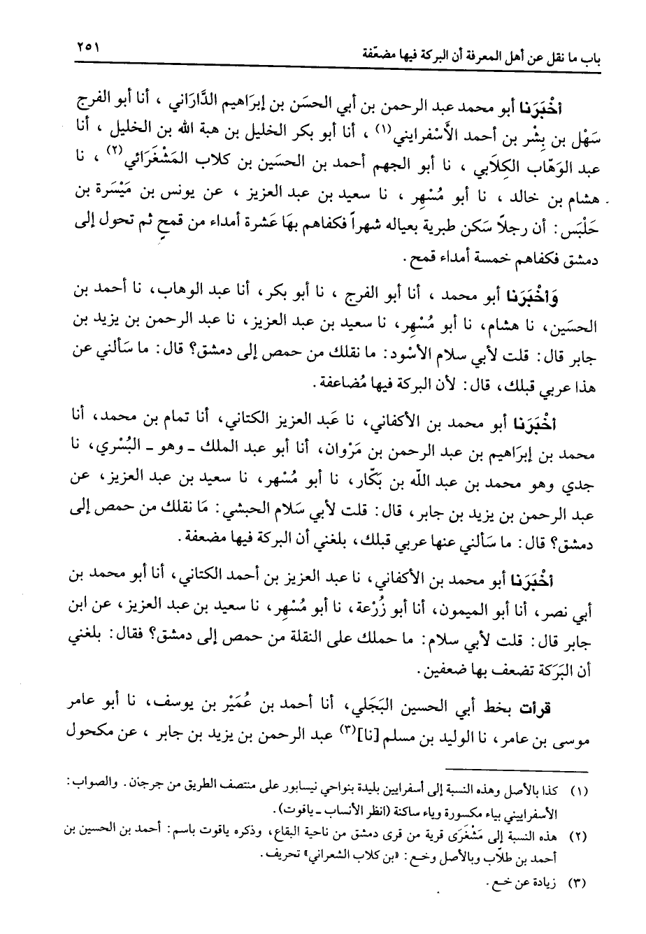 أخبرنا أبو محمد عبد الرحمن بن أبي الحسن بن إبراهيم الداراني أنا أبو الفرج سهل بن بشر بن أحمد السفرايني (1) أنا أبو بكر الخليل بن هبة الله بن الخليل أنا عبد الوهاب الكلابي نا أبو الجهم أحمد بن الحسين بن كلاب المشغرائي (2) نا هشام بن خالد نا أبو مسهر نا سعيد بن عبد العزيز عن يونس بن ميسرة بن حلبس أن رجلا سكن طبرية بعياله شهرا فكفاهم بها عشرة أمداء من قمح ثم تحول إلى دمشق فكفاهم خمسة أمداء قمح وأخبرنا أبو محمد أنا أبو الفرج نا أبو بكر أنا عبد الوهاب نا أحمد بن الحسين نا هشام نا أبو مسهر نا سعيد بن عبد العزيز نا عبد الرحمن بن يزيد بن جابر قال قلت لأبي سلام الأسود ما نقلك من حمص إلى دمشق قال ما سألني عن هذا عربي قبلك قال لأن البركة فيها مضاعفة أخبرنا أبو محمد بن الأكفاني نا عبد العزيز الكتاني أنا تمام بن محمد أنا محمد بن إبراهيم بن عبد الرحمن بن مروان أنا أبو عبد الملك وهو البسري نا جدي وهو محمد بن عبد الله بن بكار نا أبو مسهر نا سعيد بن عبد العزيز عن عبد الرحمن بن يزيد بن جابر قال قلت لأبي سلام الحبشي ما نقلك من حمص إلى دمشق قال ما سألني عنها عربي قبلك بلغني أن البركة فيها مضعفة اخبرنا أبو محمد بن الأكفاني نا عبد العزيز بن أحمد الكتاني أنا أبو محمد بن أبي نصر أنا أبو الميمون أنا أبو زرعة نا أبو مسهر نا سعيد بن عبد العزيز عن ابن جابر قال قلت لأبي سلام ما حملك على النقلة من حمص إلى دمشق فقال بلغني أن البركة تضعف بها ضعفين قرأت بخط أبي الحسين البجلي أنا أحمد بن عمير بن يوسف نا أبو عامر موسى بن عامر نا الوليد بن مسلم نا (3) عبد الرحمن بن يزيد بن جابر عن مكحول