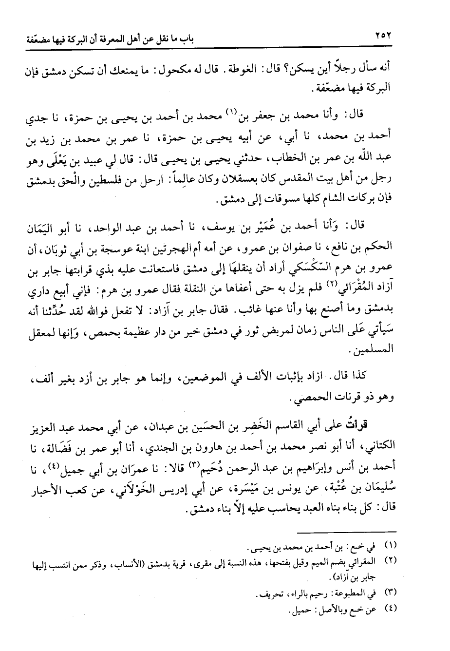 أنه سأل رجلا أين يسكن قال الغوطة قال له مكحول ما يمنعك أن تسكن دمشق فإن البركة فيها مضعفة قال وأنا محمد بن جعفر بن (1) محمد بن أحمد بن يحيى بن حمزة نا جدي أحمد بن محمد نا أبي عن أبيه يحيى بن حمزة نا عمر بن محمد بن زيد بن عبد الله بن عمر بن الخطاب حدثني يحيى بن يحيى قال قال لي عبيد بن يعلى وهو رجل من أهل بيت المقدس كان بعسقلان وكان عالما ارحل من فلسطين والحق بدمشق فإن بركات الشام كلها مسوقات إلى دمشق قال وأنا أحمد بن عمير بن يوسف نا أحمد بن عبد الواحد نا أبو اليمان الحكم بن نافع نا صفوان بن عمرو عن أمه أم الهجرتين ابنة عوسجة بن أبي ثوبان أن عمرو بن هرم السكسكي أراد أن ينقلها إلى دمشق فاستعانت عليه بذي قرابتها جابر بن آزاد المقرائي (2) فلم يزل به حتى أعفاها من النقلة فقال عمرو بن هرم فإني أبيع داري بدمشق وما أصنع بها وأنا عنها غائب فقال جابر بن آزاد لا تفعل فوالله لقد حدثنا أنه سيأتي على الناس زمان لمربض ثور في دمشق خير من دار عظيمة بحمص وإنها لمعقل المسلمين كذا قال ازاد بإثبات الألف في الموضعين وإنما هو جابر بن أزد بغير ألف وهو ذو قرنات الحمصي قرأت على ابي القاسم الخضر بن الحسين بن عبدان عن أبي محمد عبد العزيز الكتاني أنا أبو نصر محمد بن أحمد بن هارون بن الجندي أنا أبو عمر بن فضالة نا أحمد بن أنس وإبراهيم بن عبد الرحمن دحيم (3) قالا نا عمران بن أبي جميل (4) نا سليمان بن عتبة عن يونس بن ميسرة عن أبي إدريس الخولاني عن كعب الأحبار قال كل بناء بناه العبد يحاسب عليه إلا بناء دمشق