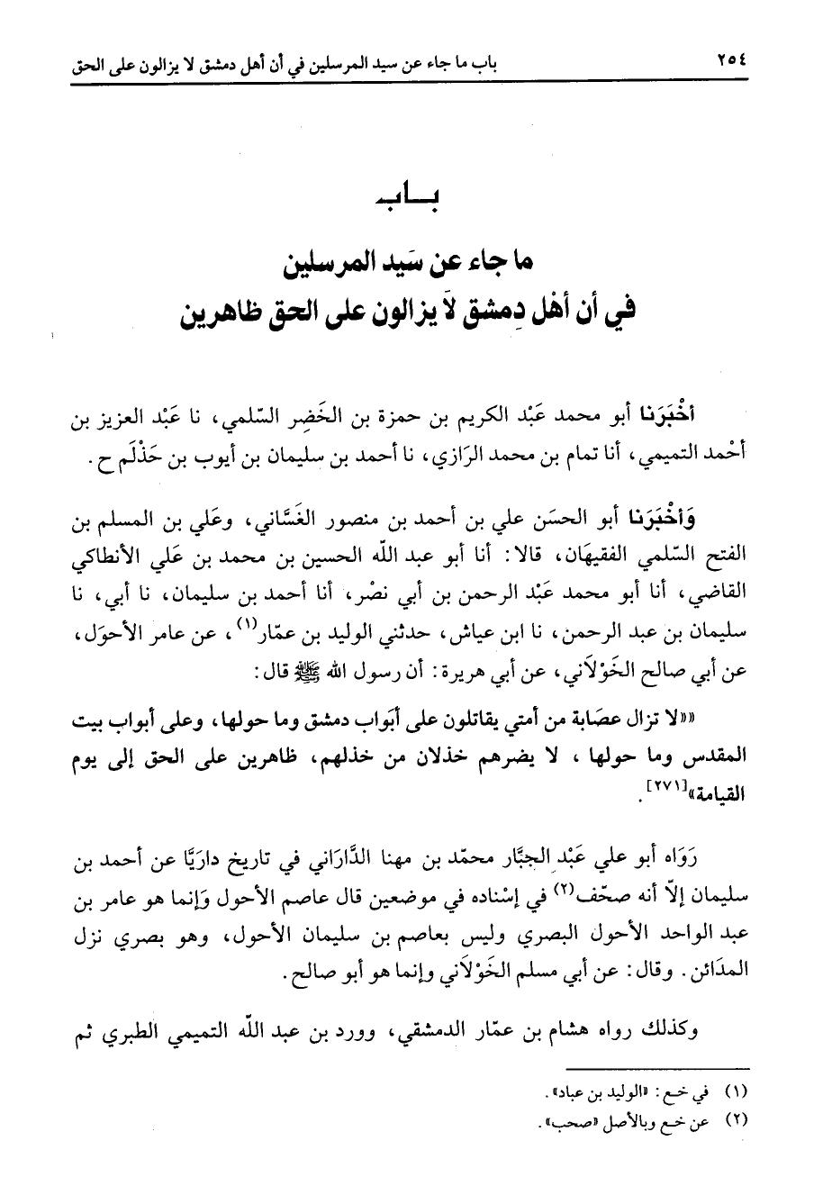 باب ما جاء عن سيد المرسلين في أن أهل دمشق لا يزالون على الحق ظاهرين " أخبرنا أبو محمد عبد الكريم بن حمزة بن الخضر السلمي نا عبد العزيز بن أحمد التميمي أنا تمام بن محمد الرازي نا أحمد بن سليمان بن أيوب بن حذلم وأخبرنا أبو الحسن علي بن أحمد بن منصور الغساني وعلي بن المسلم بن الفتح السلمي الفقيهان قالا أنا أبو عبد الله الحسين بن محمد بن علي الأنطاكي القاضي أنا أبو محمد عبد الرحمن بن أبي نصر أنا أحمد بن سليمان نا أبي نا سليمان بن عبد الرحمن نا ابن عياش حدثني الوليد بن عمار (1) عن عامر الأحول عن أبي صالح الخولاني عن أبي هريرة أن رسول الله (صلى الله عليه وسلم) قال لا تزال عصابة من أمتي يقاتلون على أبواب دمشق وما حولها وعلى أبواب بيت المقدس وما حولها لا يضرهم خذلان من خذلهم ظاهرين على الحق إلى يوم القيامة رواه أبو علي عبد الجبار محمد بن مهنا الداراني في تاريخ داريا عن أحمد بن سليمان إلا أنه صحف (2) في إسناده في موضعين قال عاصم الأحول وإنما هو عامر بن عبد الواحد الأحول البصري وليس بعاصم بن سليمان الأحول وهو بصري نزل المدائن وقال عن أبي مسلم الخولاني وإنما هو أبو صالح وكذلك رواه هشام بن عمار الدمشقي وورد بن عبد الله التميمي الطبري ثم