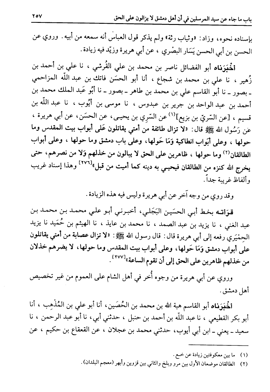 بإسناده نحوه وزاد وثياب رثة ولم يذكر قول العباس أنه سمعه من أبيه وروي عن الحسن بن أبي الحسن يسار البصري عن أبي هريرة وزيد فيه زيادة أخبرناه أبو الفضائل ناصر بن محمد بن علي القرشي نا علي بن أحمد بن زهير نا علي بن محمد بن شجاع أنا أبو الحسن فاتك بن عبد الله المزاحمي بصور نا أبو القاسم علي بن محمد بن طاهر بصور نا أبو عبد الملك محمد بن أحمد بن عبد الواحد بن جرير بن عبدوس نا موسى بن أيوب نا عبد الله بن قسيم عن السري بن بزيع (1) عن السري بن يحيى عن الحسن عن أبي هريرة عن رسول الله (صلى الله عليه وسلم) قال لا تزال طائفة من أمتي يقاتلون على أبواب بيت المقدس وما حولها وعلى أبواب أنطاكية وما حولها وعلى باب دمشق وما حولها وعلى أبواب الطالقان (2) وما حولها ظاهرين على الحق لا يبالون من خذلهم ولا من نصرهم حتى يخرج الله كنزه من الطالقان فيحيي به دينه كما أميت من قبل وهذا إسناد غريب وألفاظ غريبة جدا وقد روي من وجه آخر عن أبي هريرة وليس فيه هذه الزيادة قرأته بخط أبي الحسين البجلي أخبرني أبو علي محمد بن محمد بن عبد الغني نا يزيد بن عبد الصمد نا محمد بن عايذ نا الهيثم بن حميد نا يزيد الحميري رفعه إلى أبي هريرة قال قال رسول الله (صلى الله عليه وسلم) لا تزال عصابة من أمتي يقاتلون على أبواب دمشق وما حولها وعلى أبواب بيت المقدس وما حولها لا يضرهم خذلان من خذلهم ظاهرين على الحق إلى أن تقوم الساعة وروي عن أبي هريرة من وجوه أخر في أهل الشام على العموم من غير تخصيص أهل دمشق أخبرناه أبو القاسم هبة الله بن محمد بن الحصين أنا أبو علي بن المذهب أنا أبو بكر القطيعي نا عبد الله بن أحمد بن حنبل حدثني أبي نا أبو عبد الرحمن نا سعيد يعني ابن أبي أيوب حدثني محمد بن عجلان عن القعقاع بن حكيم عن