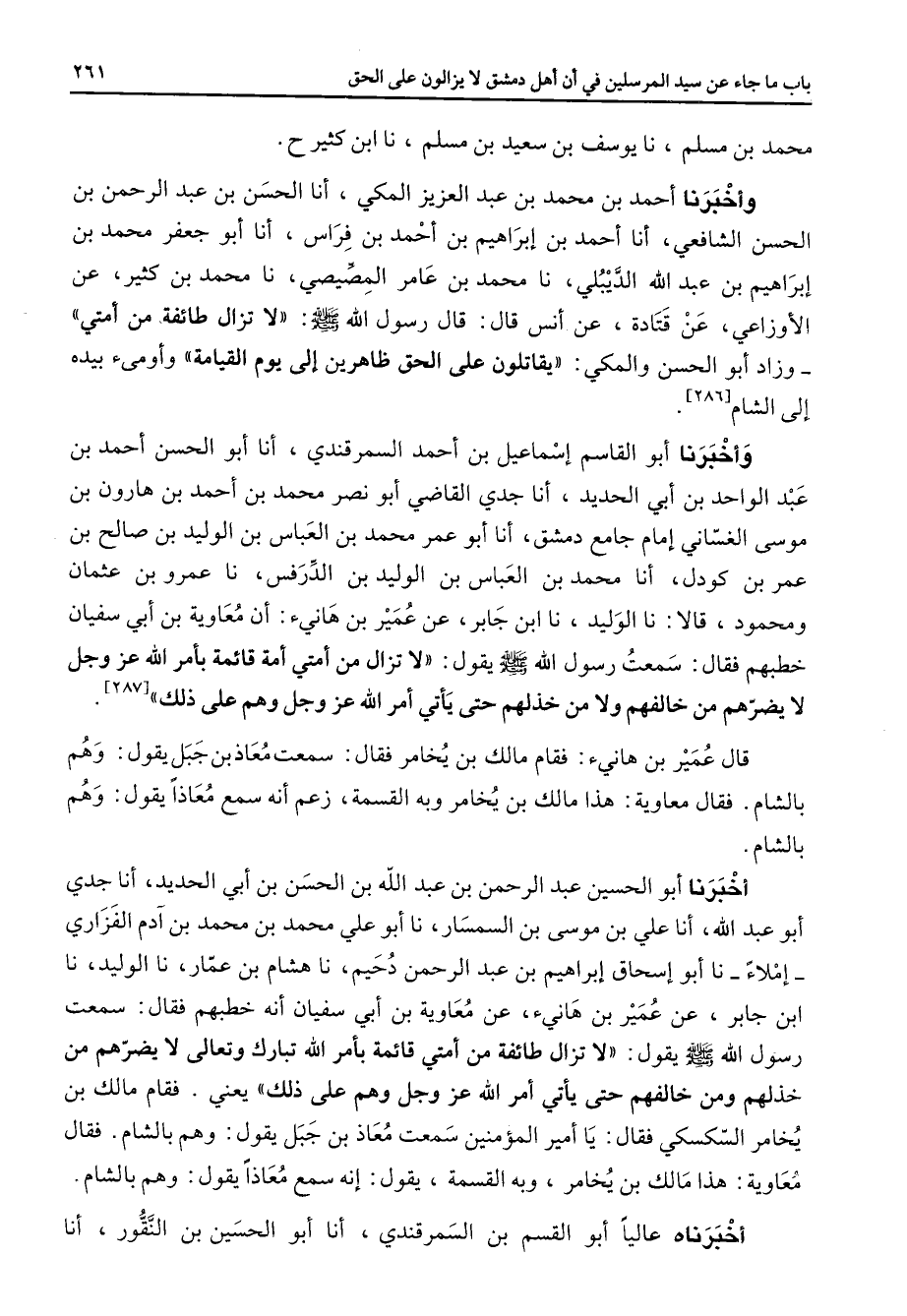 محمد بن مسلم نا يوسف بن سعيد بن مسلم نا ابن كثير وأخبرنا أحمد بن محمد بن عبد العزيز المكي أنا الحسن بن عبد الرحمن بن الحسن الشافعي أنا أحمد بن إبراهيم بن أحمد بن فراس أنا أبو جعفر محمد بن إبراهيم بن عبد الله الديبلي نا محمد بن عامر المصيصي نا محمد بن كثير عن الأوزاعي عن قتادة عن أنس قال قال رسول الله (صلى الله عليه وسلم) لا تزال طائفة من أمتي وزاد أبو الحسن والمكي يقاتلون على الحق ظاهرين إلى يوم القيامة وأومئ بيده إلى الشام وأخبرنا أبو القاسم إسماعيل بن أحمد السمرقندي أنا أبو الحسن أحمد بن عبد الواحد بن أبي الحديد أنا جدي القاضي أبو نصر محمد بن أحمد بن هارون بن موسى الغساني إمام جامع دمشق أنا أبو عمر محمد بن العباس بن الوليد بن صالح بن عمر بن كودل أنا محمد بن العباس بن الوليد بن الدرفس نا عمرو بن عثمان ومحمود قالا نا الوليد نا ابن جابر عن عمير بن هانئ أن معاوية بن أبي سفيان خطبهم فقال سمعت رسول الله (صلى الله عليه وسلم) يقول لا تزال من أمتي أمة قائمة بأمر الله عز وجل لا يضرهم من خالفهم ولا من خذلهم حتى يأتي أمر الله عز وجل وهم على ذلك قال عمير بن هانئ فقام مالك بن يخامر فقال سمعت معاذ بن جبل يقول وهم بالشام فقال معاوية هذا مالك بن يخامر وبه القسمة زعم أنه سمع معاذا يقول وهم بالشام أخبرنا أبو الحسين عبد الرحمن بن عبد الله بن الحسن بن أبي الحديد أنا جدي أبو عبد الله أنا علي بن موسى بن السمسار نا أبو علي محمد بن محمد بن آدم الفزاري إملاء نا أبو إسحاق إبراهيم بن عبد الرحمن دحيم نا هشام بن عمار نا الوليد نا ابن جابر عن عمير بن هانئ عن معاوية بن أبي سفيان أنه خطبهم فقال سمعت رسول الله (صلى الله عليه وسلم) يقول لا تزال طائفة من أمتي قائمة بأمر الله تبارك وتعالى لا يضرهم من خذلهم ومن خالفهم حتى يأتي أمر الله عز وجل وهم على ذلك يعني فقام مالك بن يخامر السكسكي فقال يا أمير المؤمنين سمعت معاذ بن جبل يقول وهم بالشام فقال معاوية هذا مالك بن يخامر وبه القسمة يقول إنه سمع معاذا يقول وهم بالشام أخبرناه عاليا أبو القسم بن السمرقندي أنا أبو الحسين بن النقور أنا