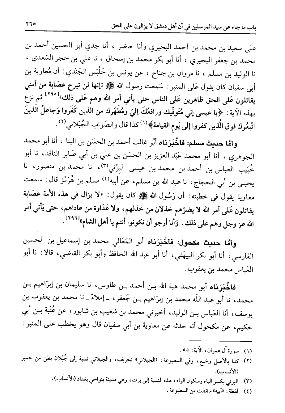 على سعيد بن محمد بن أحمد البحيري وأنا حاضر أنا جدي أبو الحسين أحمد بن محمد بن جعفر البحيري أنا أبو بكر محمد بن إسحاق نا علي بن حجر السعدي نا الوليد بن مسلم نا مروان بن جناح عن يونس بن حلبس الجندي أن معاوية بن أبي سفيان كان يقول على المنبر سمعت رسول الله (صلى الله عليه وسلم) إنها لن تبرح عصابة من أمتي يقاتلون على الحق ظاهرين على الناس حتى يأتي أمر الله وهم على ذلك ثم نزع بهذه الآية " يا عيسى إني متوفيك ورافعك إلي ومطهرك من الذين كفروا وجاعل الذين اتبعوك فوق الذين كفروا إلى يوم القيامة " (1) كذا قال والصواب الجبلاني (2) وأما حديث مسلم فأخبرناه أبو غالب أحمد بن الحسن بن البنا أنا أبو محمد الجوهري أنا أبو محمد عبد العزيز بن الحسن بن علي بن أبي صابر الناقد نا أبو خبيب العباس بن أحمد بن محمد بن عيسى البرتي (3) نا محمد بن منصور نا يحيى بن ابي الحجاج نا عبد الله بن مسلم عن أبيه (4) مسلم بن هرمز قال سمعت معاوية يقول في خطبته أن رسول الله (صلى الله عليه وسلم) كان يقول لا يزال في هذه الأمة عصابة يقاتلون على أمر الله لا يضرهم خذلان من خذلهم ولا عداوة من عاداهم حتى يأتي أمر الله عز وجل وهم على ذلك وأنا أرجو أن تكونوا أنتم يا أهل الشام وأما حديث مكحول فأخبرناه أبو المعالي محمد بن إسماعيل بن الحسين الفارسي أنا أبو بكر البيهقي أنا أبو عبد الله الحافظ وأبو بكر القاضي قالا نا أبو العباس محمد بن يعقوب فأخبرناه أبو محمد هبة الله بن أحمد بن طاوس نا سليمان بن إبراهيم بن محمد نا أبو عبد الله محمد بن إبراهيم بن جعفر إملاء نا محمد بن يعقوب بن يوسف أنا العباس بن الوليد أخبرني محمد بن شعيب بن شابور عن عتبة بن أبي حكيم عن مكحول أنه حدثه عن معاوية بن أبي سفيان قال وهو يخطب على المنبر