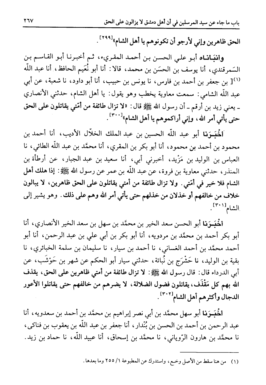 الحق ظاهرين وإني لأرجو أن تكونوهم يا أهل الشام وأنبأناه أبو علي الحسن بن أحمد المقرئ ثم أخبرنا أبو القاسم بن السمرقندي أنا يوسف بن الحسن بن محمد قالا أنا أبو نعيم الحافظ أنا عبد الله (1) بن جعفر بن أحمد بن فارس نا يونس بن حبيب أنا أبو داود نا شعبة عن أبي عبد الله الشامي سمعت معاوية يخطب وهو يقول يا أهل الشام حدثني الأنصاري يعني زيد بن أرقم أن رسول الله (صلى الله عليه وسلم) قال لا تزال طائفة من أمتي يقاتلون على الحق حتى يأتي أمر الله وإني أراكموهم يا أهل الشام أخبرنا أبو عبد الله الحسين بن عبد الملك الخلال الأديب أنا أحمد بن محمود بن أحمد بن محمود أنا أبو بكر بن المقري أنا محمد بن عبد الله الطائي نا العباس بن الوليد بن مزيد أخبرني أبي أنا سعيد بن عبد الجبار عن أرطأة بن المنذر حدثني معاوية بن فروة عن عبد الله بن عمر عن رسول الله (صلى الله عليه وسلم) إذا هلك أهل الشام فلا خير في أمتي ولا تزال طائفة من أمتي يقاتلون على الحق ظاهرين لا يبالون خلاف من خالفهم أو خذلان من خذلهم حتى يأتي أمر الله وهم على ذلك وهو يشير إلى الشام أخبرنا أبو الحسن سعد الخير بن محمد بن سهل بن سعد الخير الأنصاري أنا أبو بكر أحمد بن محمد بن مردويه أنا أبو بكر بن أبي علي بن عبد الرحمن أنا أبو أحمد محمد بن أحمد الغساني نا أحم بن سيار نا سليمان بن سلمة الخبائري نا بقية بن الوليد نا حشرج بن نباتة حدثني سيار أبو الحكم عن شهر بن حوشب عن أبي الدرداء قال قال رسول الله (صلى الله عليه وسلم) لا تزال طائفة من أمتي ظاهرين على الحق يقذف الله بهم كل مقذف يقاتلون فضول الضلالة لا يضرهم من خالفهم حتى يقاتلوا الأعور الدجال وأكثرهم أهل الشام أخبرنا أبو سهل محمد بن ابي نصر إبراهيم بن محمد بن أحمد بن سعدويه أنا عبد الرحمن بن أحمد بن الحسن بن بندار أنا جعفر بن عبد الله بن يعقوب بن فناكي نا محمد بن هارون الروياني نا محمد بن إسحاق أنا عبيد الله نا حماد بن زيد