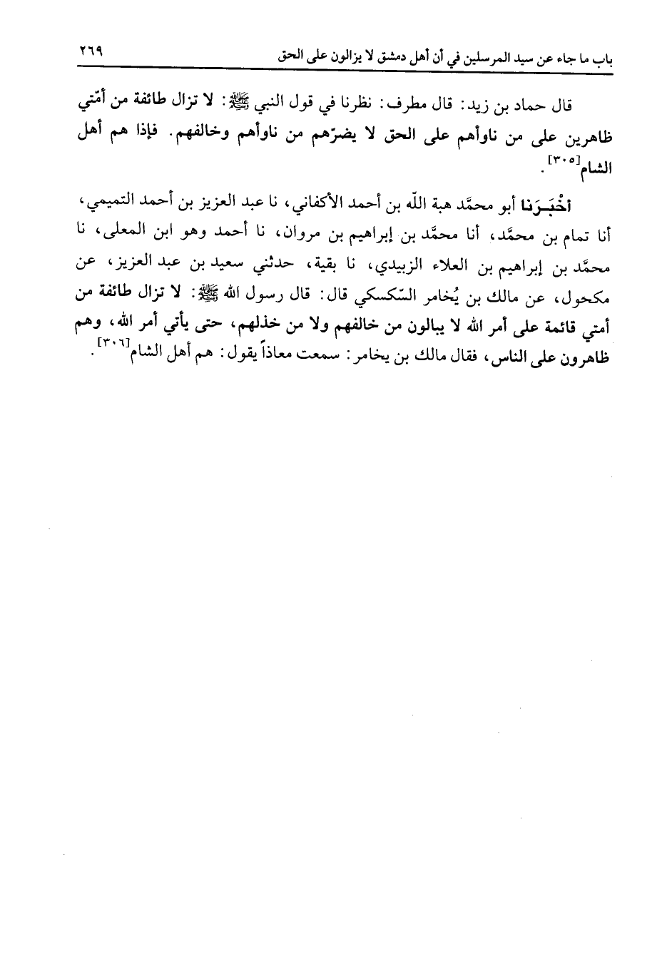 قال حماد بن زيد قال مطرف نظرنا في قول النبي (صلى الله عليه وسلم) لا تزال طائفة من أمتي ظاهرين على من ناوأهم على الحق لا يضرهم من ناوأهم وخالفهم فإذا هم أهل الشام أخبرنا أبو محمد هبة الله بن أحمد الأكفاني نا عبد العزيز بن أحمد التميمي أنا تمام بن محمد أنا محمد بن إبراهيم بن مروان نا أحمد وهو ابن المعلى نا محمد بن إبراهيم بن العلاء الزبيدي نا بقية حدثني سعيد بن عبد العزيز عن مكحول عن مالك بن يخامر السكسكي قال قال رسول الله (صلى الله عليه وسلم) لا تزال طائفة من أمتي قائمة على أمر الله لا يبالون من خالفهم ولا من خذلهم حتى يأتي أمر الله وهم ظاهرون على الناس فقال مالك بن يخامر سمعت معاذا يقول هم أهل الشام "