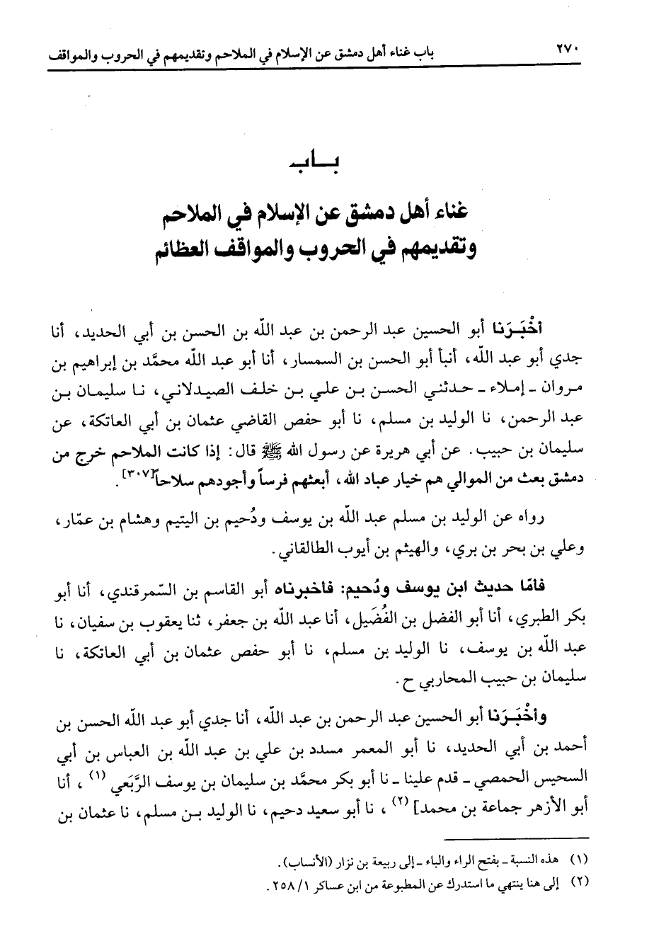 باب غناء أهل دمشق عن الإسلام في الملاحم وتقديمهم في الحروب والمواقف العظائم " أخبرنا أبو الحسين عبد الرحمن بن عبد الله بن الحسن بن أبي الحديد أنا جدي أبو عبد الله أنبأ أبو الحسن بن السمسار أنا أبو عبد الله محمد بن إبراهيم بن مروان إملاء حدثني الحسن بن علي بن خلف الصيدلاني نا سليمان بن عبد الرحمن نا الوليد بن مسلم نا أبو حفص القاضي عثمان بن أبي العاتكة عن سليمان بن حبيب عن ابي هريرة عن رسول الله (صلى الله عليه وسلم) قال إذا كانت الملاحم خرج من دمشق بعث من الموالي هم خيار عباد الله أبعثهم فرسا وأجودهم سلاحا رواه عن الوليد بن مسلم عبد الله بن يوسف ودحيم بن اليتيم وهشام بن عمار وعلي بن بحر بن بري والهيثم بن ايوب الطالقاني فأما حديث ابن يوسف ودحيم فأخبرناه أبو القاسم بن السمرقندي أنا أبو بكر الطبري أنا أبو الفضل بن الفضيل أنا عبد الله بن جعفر ثنا يعقوب بن سفيان نا عبد الله بن يوسف نا الوليد بن مسلم نا أبو حفص عثمان بن أبي العاتكة نا سليمان بن حبيب المحاربي وأخبرنا أبو الحسين عبد الرحمن بن عبد الله أنا جدي أبو عبد الله الحسن بن أحمد بن أبي الحديد نا أبو المعمر مسدد بن علي بن عبد الله بن العباس بن أبي السحيس الحمصي قدم علينا نا أبو بكر محمد بن سليمان بن يوسف الربعي (1) أنا أبو الأزهر جماعة بن محمد (2) نا أبو سعيد دحيم نا الوليد بن مسلم نا عثمان بن