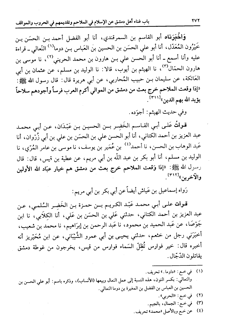 وأخبرناه أبو القاسم بن السمرقندي أنا أبو الفضل أحمد بن الحسن بن خيرون المعدل أنا أبو علي الحسن بن الحسين بن العباس بن دوما (1) النعالي قراءة عليه وأنا أسمع أنا أبو الحسن علي بن هارون بن محمد الحريني (2) نا موسى بن هارون الحمال (3) نا الهيثم بن أيوب قالا نا الوليد بن مسلم عن عثمان بن أبي العاتكة عن سليمان بن حبيب المحاربي عن أبي هريرة قال قال رسول الله (صلى الله عليه وسلم) إذا وقعت الملاحم خرج بعث من دمشق من الموالي أكرم العرب فرسا وأجودهم سلاحا يؤيد الله بهم الدين وفي حديث الهيثم أجوده قرأت على أبي القاسم الخضر بن الحسين بن عبدان عن أبي محمد عبد العزيز بن أحمد الكتاني أنا أبو الحسن علي بن الحسن بن علي بن أبي زروان أنا عبد الوهاب بن الحسن نا أحمد (4) بن عمير بن يوسف نا موسى بن عامر المري نا الوليد بن مسلم أنا أبو بكر بن عبد الله بن أبي مريم عن عطية بن قيس قال قال رسول الله (صلى الله عليه وسلم) إذا وقعت الملاحم خرج بعث من دمشق هم خيار عباد الله الأولين والآخرين رواه إسماعيل بن عياش أيضا عن أبي بكر بن أبي مريم قرأت على ابي محمد عبد الكريم بن حمزة بن الخضر السلمي عن عبد العزيز بن أحمد الكتاني حدثني علي بن الحسن بن علي أنا الكلابي نا ابن جوصا عن عبد الحميد بن محمود نا عبد الرحمن بن إبراهيم نا محمد بن شعيب أخبرني رجل من خثعم حدثني يحيى بن أبي عمرو الشيباني عن ابن محيريز أنه أخبره قال خير فوارس تظل السماء فوارس من قيس يخرجون من غوطة دمشق يقاتلون الدجال