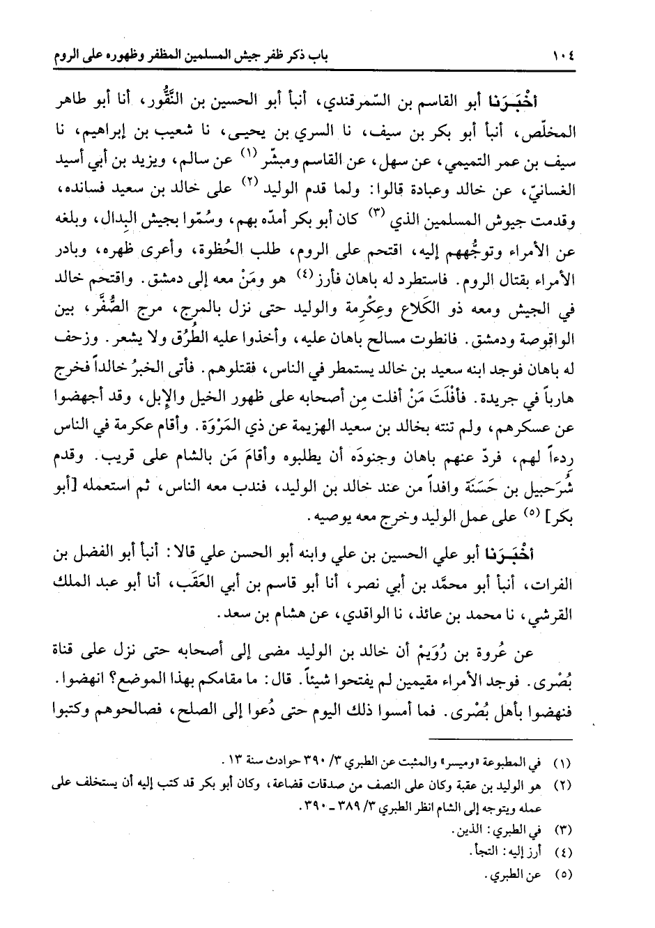 أخبرنا أبو القاسم بن السمرقندي أنبأ أبو الحسين بن النقور أنا أبو طاهر المخلص أنبأ أبو بكر بن سيف نا السري بن يحيى نا شعيب بن إبراهيم نا سيف بن عمر التميمي عن سهل عن القاسم ومبشر (1) عن سالم ويزيد بن أبي أسيد الغساني عن خالد وعبادة قالوا ولما قدم الوليد (2) على خالد بن سعيد فسانده وقدمت جيوش المسلمين الذي (3) كان أبو بكر أمده بهم وسموا بجيش البدال وبلغه عن الأمراء وتوجههم إليه اقتحم على الروم طلب الحظوة وأعرى ظهره وبادر الأمراء بقتال الروم فاستطرد له باهان فأرز (4) هو ومن معه إلى دمشق واقتحم خالد في الجيش ومعه ذو الكلاع وعكرمة والوليد حتى نزل بالمرج مرج الصفر بين الواقوصة ودمشق فانطوت مسالح باهان عليه وأخذوا عليه الطرق ولا يشعر وزحف له باهان فوجد ابنه سعيد بن خالد يستمطر في الناس فقتلوهم فأتى الخبر خالدا فخرج هاربا في جريدة فأفلت من أفلت من أصحابه على ظهور الخيل والإبل وقد أجهضوا عن عسكرهم ولم تنته بخالد بن سعيد الهزيمة عن ذي المروة وأقام عكرمة في الناس ردءا لهم فرد عنهم باهان وجنوده أن يطلبوه واقام من بالشام على قريب وقدم شرحبيل بن حسنة وافدا من عند خالد بن الوليد فندب معه الناس ثم استعمله أبو بكر (5) على عمل الوليد وخرج معه يوصيه أخبرنا أبو علي الحسين بن علي وابنه أبو الحسن علي قالا أنبأ أبو الفضل بن الفرات أنبأ أبو محمد بن ابي نصر أنا أبو القاسم بن ابي العقب أنا أبو عبد الملك القرشي نا محمد بن عائذ نا الواقدي عن هشام بن سعد عن عروة بن رويم أن خالد بن الوليد مضى إلى أصحابه حتى نزل على قناة بصرى فوجد الأمراء مقيمين لم يفتحوا شيئا قال ما مقامكم بهذا الموضع انهضوا فنهضوا بأهل بصرى فما أمسوا ذلك اليوم حتى دعوا إلى الصلح فصالحوهم وكتبوا