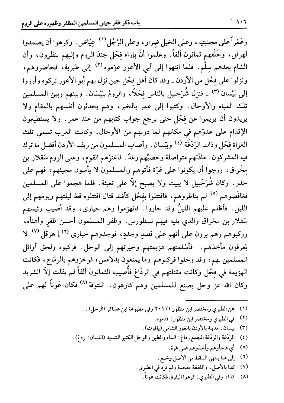 وعمرا على مجنبتيه وعلى الخيل ضرار وعلى الرجل (1) عياض وكرهوا أن يصمدوا لهرقل وخلفهم ثمانون ألفا وعلموا أن بإزاء فحل جند الروم وإليهم ينظرون وأن الشام بعدهم سلم فلما انتهوا إلى أبي الأعور عوموه (2) إلى طبرية فحاصروهم ونزلوا على فحل من الأردن وقد كان أهل فحل حين نزل بهم أبو الأعور تركوه وأرزوا إلى بيسان (3) فنزل شرحبيل بالناس فحلا والروم ببيسان وبينهم وبين المسلمين تلك المياه والأوحال وكتبوا إلى عمر بالخبر وهم يحدثون أنفسهم بالمقام ولا يريدون أن يريموا عن فحل حتى يرجع جواب كتابهم من عند عمر ولا يستطيعون الإقدام على عدوهم في مكانهم لما دونهم من الأوحال وكانت العرب تسمي تلك الغزاة فحل وذات الردغة (4) وبيسان وأصاب المسلمون من ريف الأردن أفضل ما ترك فيه المشركون مادتهم متواصلة وخصبهم رغد فاغترهم القوم وعلى الروم سقلار بن مخراق ورجوا أن يكونوا على غرة فأتوهم والمسلمون لا يأمنون مجيئهم فهم على حذر وكان شرحبيل لا يبيت ولا يصبح إلا على تعبئة فلما هجموا على المسلمين فغافصوهم (5) لم يناظروهم فاقتتلوا بفحل كأشد قتال اقتتلوه قط ليلتهم ويومهم إلى الليل فأظلم عليهم الليل وقد حاروا فانهزموا وهم حيارى وقد أصيب رئيسهم سقلار بن مخراق والذي يليه فيهم نسطورس وظفر المسلمون أحسن ظفر وأهنأه وركبوهم وهم يرون على أنهم على قصد وجدد فوجدوهم حيارى (6) هرقل (7) لا يعرفون مأخذهم فأسلمتهم هزيمتهم وحيرتهم إلى الوحل فركبوه ولحق أوائل المسلمين بهم وقد وحلوا فركبوهم وما يمنعون يد لامس فوخزوهم بالرماح فكانت الهزيمة في فحل وكانت مقتلتهم في الرداغ فأصيب الثمانون ألفا لم يفلت إلا الشريد وكان الله عز وجل يصنع للمسلمين وهم كارهون النتوفة (8) فكان عونا لهم على