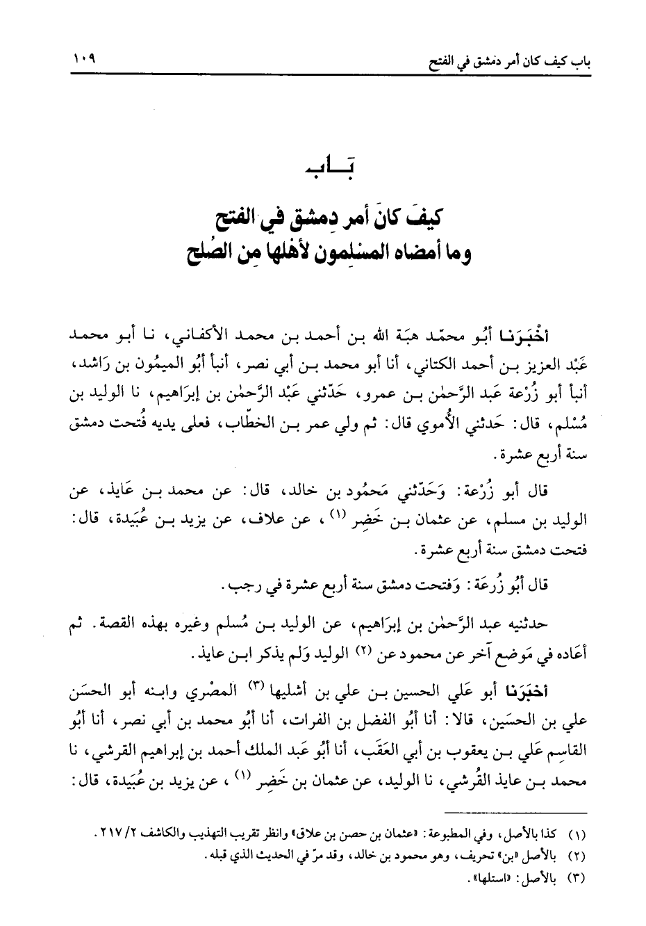 " باب كيف كان أمر دمشق في الفتح وما أمضاه المسلمون لأهلها من الصلح " أخبرنا أبو محمد هبة الله بن أحمد بن محمد الأكفاني نا أبو محمد عبد العزيز بن أحمد الكتاني أنا أبو محمد بن أبي نصر أنبأ أبو الميمون بن راشد أنبأ أبو زرعة عبد الرحمن بن عمرو حدثني عبد الرحمن بن إبراهيم نا الوليد بن مسلم قال حدثني الأموي قال ثم ولي عمر بن الخطاب فعلى يديه فتحت دمشق سنة أربع عشرة قال أبو زرعة وحدثني محمود بن خالد قال عن محمد بن عايذ عن الوليد بن مسلم عن عثمان بن خضر (1) عن علاف عن يزيد بن عبيدة قال فتحت دمشق سنة أربع عشرة قال أبو زرعة وفتحت دمشق سنة أربع عشرة في رجب حدثنيه عبد الرحمن بن إبراهيم عن الوليد بن مسلم وغيره بهذه القصة ثم أعاده في موضع آخر عن محمود عن (2) الوليد ولم يذكر ابن عايذ أخبرنا أبو علي الحسين بن علي بن أشليها (3) المصري وابنه أبو الحسن علي بن الحسين قالا أنا أبو الفضل بن الفرات أنا أبو محمد بن أبي نصر أنا أبو القاسم علي بن يعقوب بن أبي العقب أنا أبو عبد الملك أحمد بن إبراهيم القرشي نا محمد بن عايذ القرشي نا الوليد عن عثمان بن خضر (1) عن يزيد بن عبيدة قال