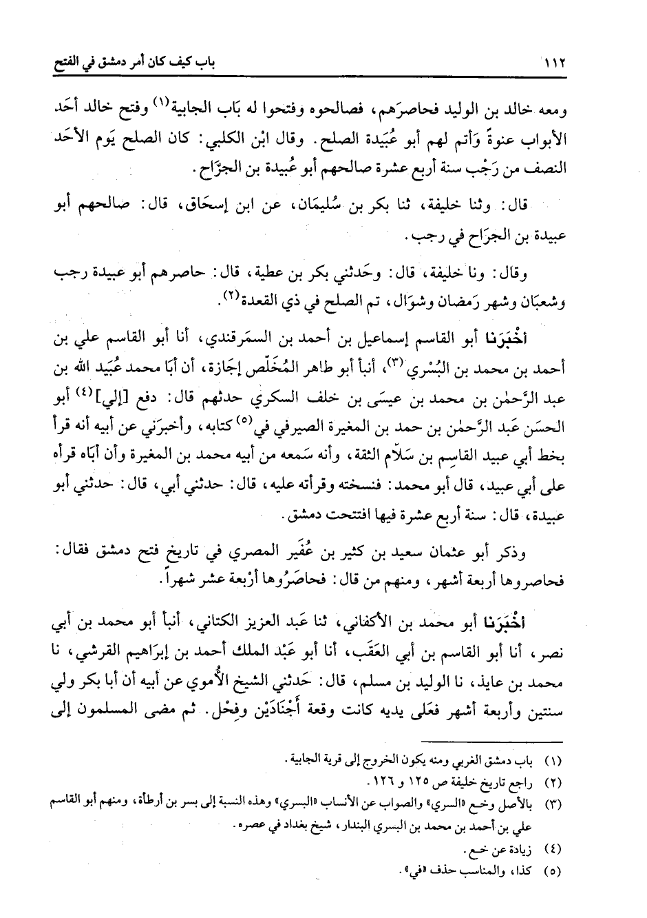 ومعه خالد بن الوليد فحاصرهم فصالحوه وفتحوا له باب الجابية (1) وفتح خالد أحد الأبواب عنوة وأتم لهم أبو عبيدة الصلح وقال ابن الكلبي كان الصلح يوم الأحد النصف من رجب سنة أربع عشرة صالحهم أبو عبيدة بن الجراح قال وثنا خليفة ثنا بكر بن سليمان عن ابن إسحاق قال صالحهم أبو عبيدة بن الجراح في رجب وقال ونا خليفة قال وحدثني بكر بن عطية قال حاصرهم أبو عبيدة رجب وشعبان وشهر رمضان وشوال تم الصلح في ذي القعدة (2) أخبرنا أبو القاسم إسماعيل بن أحمد بن السمرقندي أنا أبو القاسم علي بن أحمد بن محمد بن البسري (3) أنبأ أبو طاهر المخلص إجازة أن أبا محمد عبيد الله بن عبد الرحمن بن محمد بن عيسى بن خلف السكري حدثهم قال دفع إلي (4) أبو الحسن عبد الرحمن بن حمد بن المغيرة الصيرفي في (5) كتابه وأخبرني عن أبيه أنه قرأ بخط أبي عبيد القاسم بن سلام الثقة وأنه سمعه من أبيه محمد بن المغيرة وأن أباه قرأه على أبي عبيد قال أبو محمد فنسخته وقرأته عليه قال حدثني أبي قال حدثني أبو عبيدة قال سنة أربع عشرة فيها افتتحت دمشق وذكر أبو عثمان سعيد بن كثير بن عفير المصري في تاريخ فتح دمشق فقال فحاصروها أربعة أشهر ومنهم من قال فحاصروها أربعة عشر شهرا أخبرنا أبو محمد بن الأكفاني ثنا عبد العزيز الكتاني أنبأ أبو محمد بن أبي نصر أنا أبو القاسم بن أبي العقب أنا أبو عبد الملك أحمد بن إبراهيم القرشي نا محمد بن عايذ نا الوليد بن مسلم قال حدثني الشيخ الأموي عن أبيه أن أبا بكر ولي سنتين وأربعة اشهر فعلى يديه كانت وقعة أجنادين وفحل ثم مضى المسلمون إلى