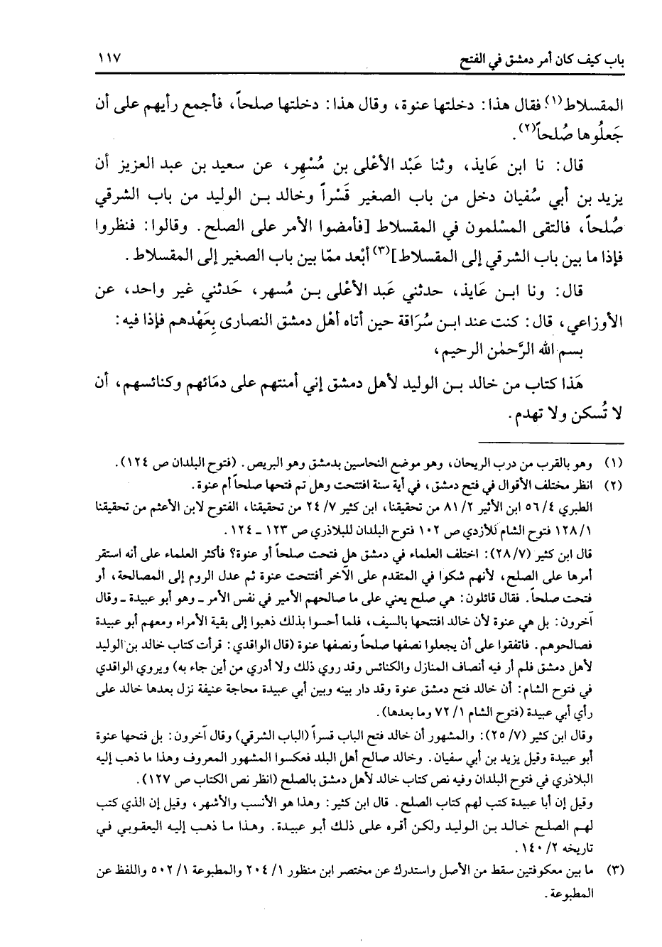 المقسلاط (1) فقال هذا دخلتها عنوة وقال هذا دخلتها صلحا فأجمع رأيهم على أن جعلوها صلحا (2) قال نا ابن عايذ وثنا عبد الأعلى بن مسهر عن سعيد بن عبد العزيز أن يزيد بن أبي سفيان دخل من باب الصغير قسرا وخالد بن الوليد من باب الشرقي صلحا فالتقى المسلمون في المقسلاط فأمضوا الأمر على الصلح وقالوا فنظروا فإذا ما بين باب الشرقي إلى المقسلاط (3) أبعد مما بين باب الصغير إلى المقسلاط قال ونا ابن عايذ حدثني عبد الأعلى بن مسهر حدثني غير واحد عن الأوزاعي قال كنت عند ابن سراقة حين أتاه أهل دمشق النصارى بعهدهم فإذا فيه بسم الله الرحمن الرحيم هذا كتاب من خالد بن الوليد لأهل دمشق إني أمنتهم على دمائهم وكنائسهم أن لا تسكن ولا تهدم
