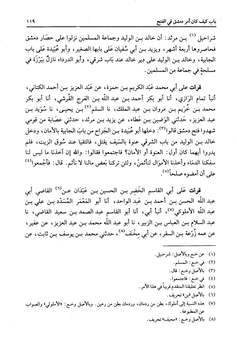 شراحيل (1) بن مرثد أن خالد بن الوليد وجماعة المسلمين نزلوا على حصار دمشق فحاصروها أربعة اشهر ويزيد بن أبي سفيان على بابها الصغير وأبو عبيدة على باب الجابية وخالد بن الوليد على دير خالد عند باب شرقي وأبو الدرداء نازل ببرزة في مسلحة في جماعة من المسلمين قرأت على أبي محمد عبد الكريم بن حمزة عن عبد العزيز بن أحمد الكتاني أنبأ تمام الرازي أنا أبو بكر أحمد بن عبد الله بن الفرج القرشي أنا أبو بكر محمد بن خريم بن مروان بن عبد الملك نا السلم (2) بن يحيى نا سويد بن عبد العزيز حدثني الوضين بن عطاء عن يزيد بن مرثد حدثني عصابة من قومي شهدوا فتح دمشق قالوا (3) دخلها أبو عبيدة بن الجراح من باب الجابية بالأمان ودخل خالد بن الوليد من باب الشرقي عنوة بالسيف يقتل فالتقيا عند سوق الزيت فلم يدروا أيهما كان أول العنوة أو الأمان فاجتمعوا فقالوا والله إن أخذنا ما ليس لنا سفكنا الدماء وأخذنا الأموال لنأثمن ولئن تركنا بعض مالنا لا نأثم قال فأجمعوا (4) على أن أمضوه صلحا (5) قرأت على أبي القاسم الخضر بن الحسين بن عبدان عن (6) القاضي أبي عبد الله الحسن بن أحمد بن عبد الواحد أنا أبو المعمر المسدد بن علي بن عبد الله الأملوكي (7) أنبأ أبي أنا أبو القاسم عبد الصمد بن سعيد القاضي نا عبد السلام بن العباس بن الزبير نا أبو عبد الله محمد بن عبد العزيز عن عفير عن عمه زرعة بن السقر عن أبي مخنف (8) حدثني محمد بن يوسف بن ثابت عن