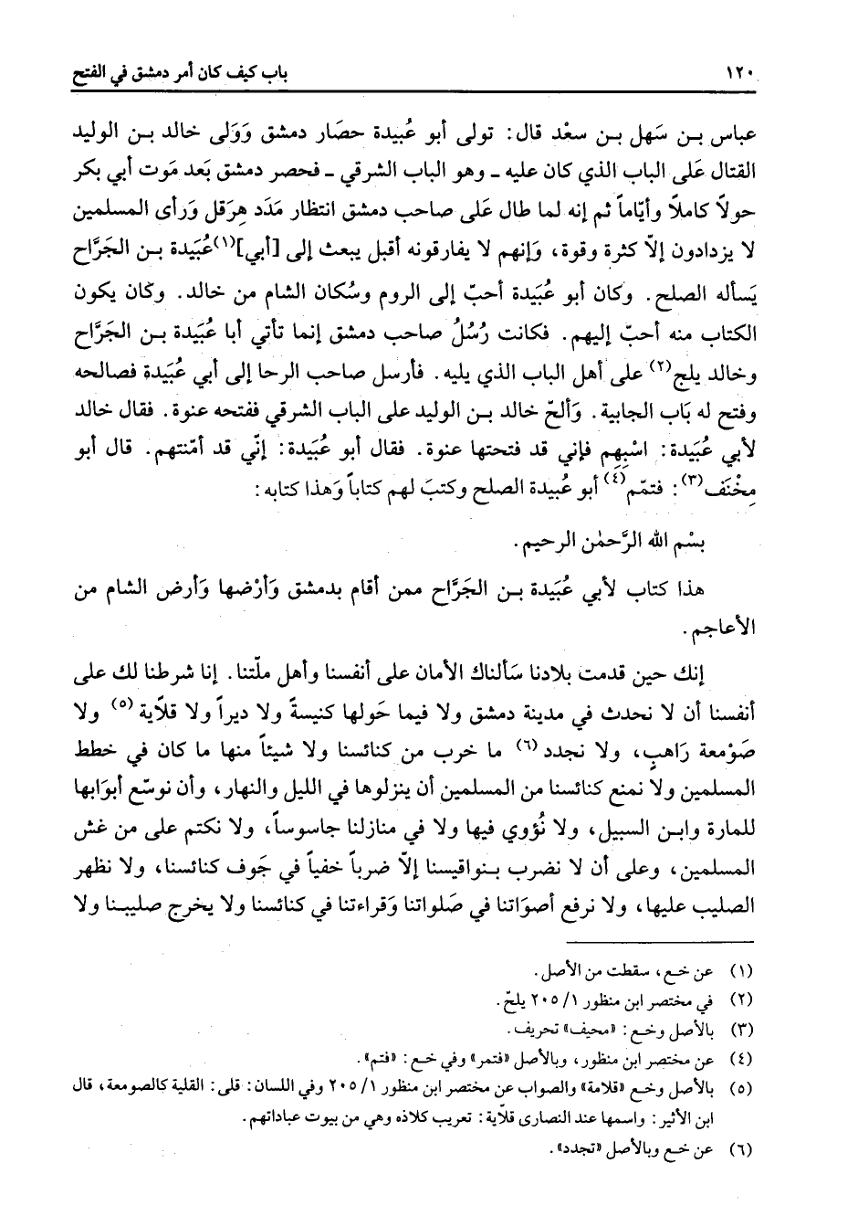 عباس بن سهل بن سعد قال تولى أبو عبيدة حصار دمشق وولي خالد بن الوليد القتال على الباب الذي كان عليه وهو الباب الشرقي فحصر دمشق بعد موت أبي بكر حولا كاملا وأياما ثم إنه لما طال على صاحب دمشق انتظار مدد هرقل ورأى المسلمين لا يزدادون إلا كثرة وقوة وإنهم لا يفارقونه أقبل يبعث إلى أبي (1) عبيدة بن الجراح يسأله الصلح وكان أبو عبيدة أحب إلى الروم وسكان الشام من خالد وكان يكون الكتاب منه أحب إليهم فكانت رسل صاحب دمشق إنما تأتي أبا عبيدة بن الجراح وخالد يلج (2) على أهل الباب الذي يليه فأرسل صاحب الرحا إلى أبي عبيدة فصالحه وفتح له باب الجابية وألح خالد بن الوليد على الباب الشرقي ففتحه عنوة فقال خالد لأبي عبيدة اسبهم فإني قد فتحتها عنوة فقال أبو عبيدة إني قد أمنتهم قال أبو مخنف (3) فتمم (4) أبو عبيدة الصلح وكتب لهم كتابا وهذا كتابه بسم الله الرحمن الرحيم هذا كتاب لأبي عبيدة بن الجراح ممن أقام بدمشق وأرضها وأرض الشام من الأعاجم إنك حين قدمت بلادنا سألناك الأمان على أنفسنا وأهل ملتنا إنا شرطنا لك على أنفسنا أن لا نحدث في مدينة دمشق ولا فيما حولها كنيسة ولا ديرا ولا قلاية (5) ولا صومعة راهب ولا نجدد (6) ما خرب من كنائسنا ولا شيئا منها ما كان في خطط المسلمين ولا نمنع كنائسنا من المسلمين أن ينزلوها في الليل والنهار وأن نوسع أبوابها للمارة وابن السبيل ولا نؤوي فيها ولا في منازلنا جاسوسا ولا نكتم على من غش المسلمين وعلى أن لا نضرب بنواقيسنا إلا ضربا خفيا في جوف كنائسنا ولا نظهر الصليب عليها ولا نرفع أصواتنا في صلواتنا وقراءتنا في كنائسنا ولا يخرج صليبنا ولا