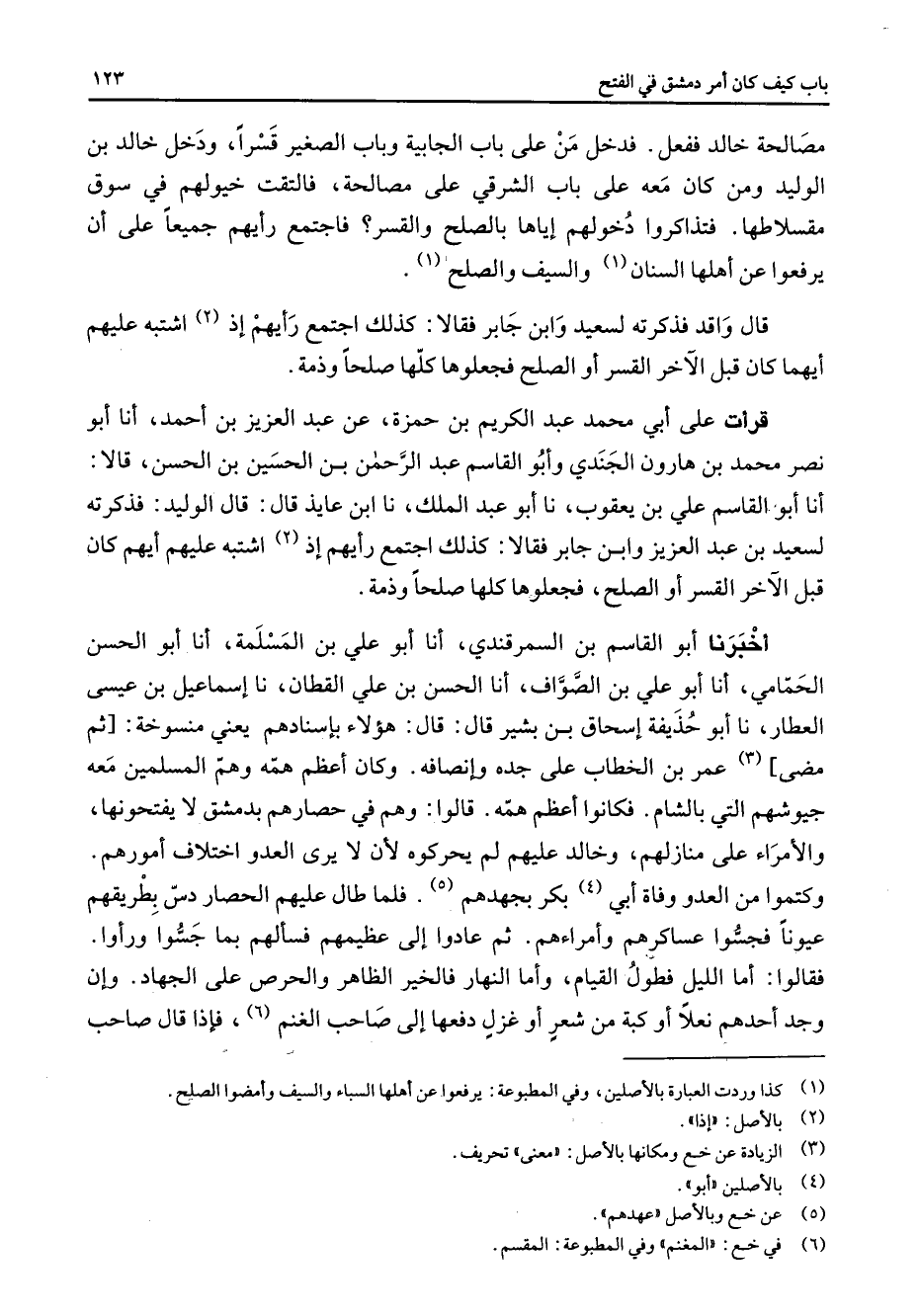 إلى مصالحة خالد ففعل فدخل من على باب الجابية وباب الصغير قسرا ودخل خالد بن الوليد ومن كان معه على باب الشرقي على مصالحة فالتقت خيولهم في سوق مقسلاطها فتذاكروا دخولهم إياها بالصلح والقسر فاجتمع رأيهم جميعا على أن يرفعوا عن أهلها السنان (1) والسيف والصلح (2) قال واقد فذكرته لسعيد وابن جابر فقالا كذلك اجتمع رأيهم إذ (3) اشتبه عليهم أيهما كان قبل الآخر القسر أو الصلح فجعلوها كلها صلحا وذمة قرأت على أبي محمد عبد الكريم بن حمزة عن عبد العزيز بن أحمد أنا أبو نصر محمد بن هارون الجندي وأبو القاسم عبد الرحمن بن الحسين بن الحسن قالا أنا أبو القاسم علي بن يعقوب نا أبو عبد الملك نا ابن عايذ قال قال الوليد فذكرته لسعيد بن عبد العزيز وابن جابر فقالا كذلك اجتمع رأيهم إذ (2) اشتبه عليهم أيهم كان قبل الآخر القسر أو الصلح فجعلوها كلها صلحا وذمة أخبرنا أبو القاسم بن السمرقندي أنا أبو علي بن المسلمة أنا أبو الحسن الحمامي أنا أبو علي بن الصواف أنا الحسن بن علي القطان نا إسماعيل بن عيسى العطار نا أبو حذيفة إسحاق بن بشير قال قال هؤلاء بإسنادهم يعني منسوخة ثم مضى (3) عمر بن الخطاب على جده وإنصافه وكان أعظم همه وهم المسلمين معه جيوشهم التي بالشام فكانوا أعظم همه قالوا وهم في حصارهم بدمشق لا يفتحونها والأمراء على منازلهم وخالد عليهم لم يحركوه لأن لا يرى العدو اختلاف أمورهم وكتموا من العدو وفاة أبي (4) بكر بجهدهم (5) فلما طال عليهم الحصار دس بطريقهم عيونا فجسوا عساكرهم وأمراءهم ثم عادوا إلى عظيمهم فسألهم بما جسوا ورأوا فقالوا أما الليل فطول القيام وأما النهار فالخير الظاهر والحرص على الجهاد وإن وجد أحدهم نعلا أو كبة من شعر أو غزل دفعها إلى صاحب الغنم (6) فإذا قال صاحب