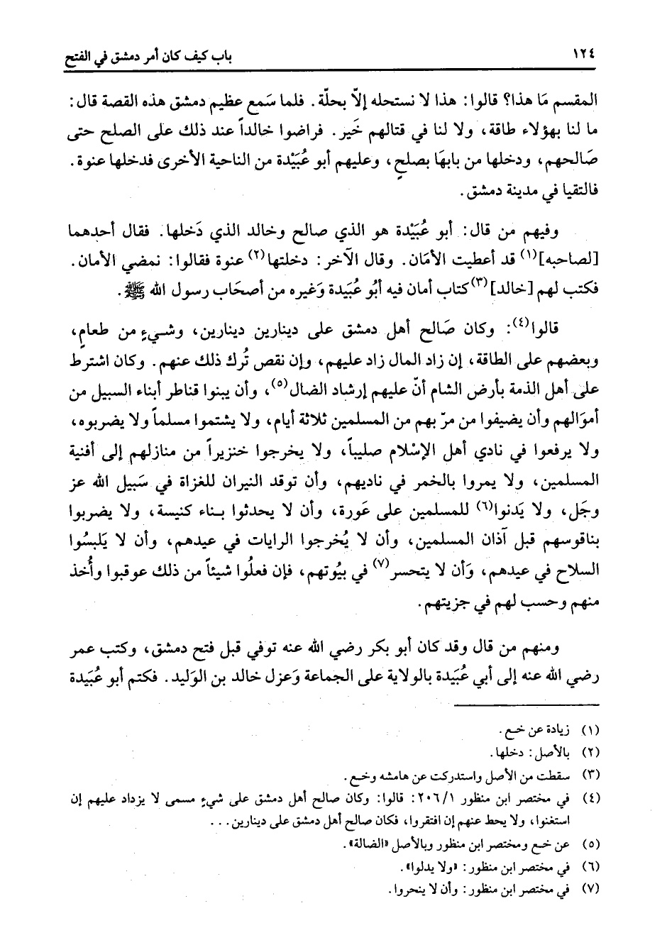 (4) في مختصر ابن منظور 1 / 206: قالوا: وكان صالح أهل دمشق على شئ مسمى لا يزداد علهيم إن استغنوا ولا يحط عنهم إن افتقروا فكان صالح أهل دمشق على دينارين
