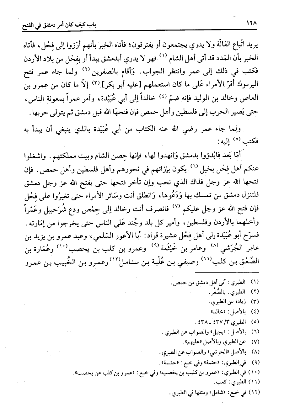 يريد اتباع الفالة ولا يدري يجتمعون أو يفترقون فأتاه الخبر بأنهم أرزوا إلى فحل فأتاه الخبر بأن المدد قد أتى أهل الشام (1) فهو لا يدري أبدمشق يبدأ أو بفحل من بلاد الأردن فكتب في ذلك إلى عمر وانتظر الجواب وأقام بالصفرين (2) ولما جاء عمر فتح اليرموك أقر الأمراء على ما كان استعملهم عليه أبو بكر (3) إلا ما كان من عمرو بن العاص وخالد بن الوليد فإنه ضم (4) خالدا إلى أبي عبيدة وأمر عمرا بمعونة الناس حتى يصير الحرب إلى فلسطين وأهل حمص فإن فتحها الله قبل دمشق ثم يتولى حربها ولما جاء عمر Bهـ الكتاب من أبي عبيدة بالذي ينبغي أن يبدأ به فكتب (5) إليه أما بعد فابدؤوا بدمشق وانهدوا لها فإنها حصن الشام وبيت مملكتهم واشغلوا عنكم أهل فحل بخيل (6) يكون بإزائهم في نحورهم وأهل فلسطين وأهل حمص فإن فتحها الله عز وجل فذاك الذي نحب وإن تأخر فتحها حتى يفتح الله عز وجل دمشق فلتنزل دمشق من تمسك بها ودعوها وانطلق أنت وسائر الأمراء حتى تغيروا على فحل فإن فتح الله عز وجل عليكم (7) فانصرف أنت وخالد إلى حمص ودع شرحبيل وعمرا وأخلهما بالأردن وفلسطين وأمير كل بلد وجند على الناس حتى يخرجوا من إمارته فسرح أبو عبيدة إلى أهل فحل عشيرة قواد أبا الأعور السلمي وعبد عمرو بن يزيد بن عامر الجرشي (8) وعامر بن خيثمة (9) وعمرو بن كلب بن يحصب (10) وعمارة بن الصعق بن كلب (11) وصيفي بن علبة بن سنامل (12) وعمرو بن الخبيب بن عمرو