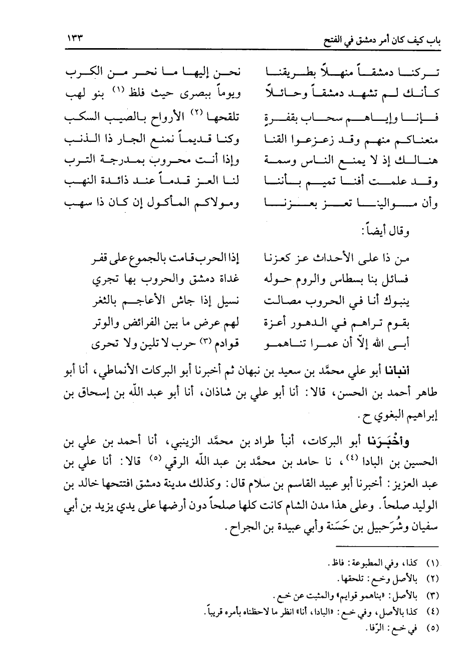 تركنا دمشقا منهلا بطريقنا * نحن إليها ما نحر من الكرب كأنك لم تشهد دمشقا وحائلا * ويوما ببصرى حيث فلظ (1) بنو لهب فإنا وإياهم سحاب بقفرة * تلقحها (2) الأرواح بالصيب السكب منعناكم منهم وقد زعزعوا القنا * وكنا قديما نمنع الجار ذا الذنب هنالك إذ لا يمنع الناس وسمة * وإذا أنت محروب بمدرجة الترب وقد علمت أفنا تميم بأننا * لنا العز قدما عند ذائدة النهب وأن موالينا تعز بعزنا * ومولاكم المأكول إن كان ذا سهب وقال أيضا: من ذا على الأحداث عز كعزنا * إذا الحرب قامت بالجموع على قفر فسائل بنا بسطاس والروم حوله * غداة دمشق والحروب بها تجري ينبوك أنا في الحروب مصالت * نسيل إذا جاش الأعاجم بالثغر بقوم تراهم في الدهور أعزة * لهم عرض ما بين الفرائض والوتر أبى الله إلا أن عمرا تناهمو * قوادم (3) حرب لا تلين ولا تحرى أنبأنا أبو علي محمد بن سعيد بن نبهان ثم أخبرنا أبو البركات الأنماطي أنا أبو طاهر أحمد بن الحسن قالا أنا أبو علي بن شاذان أنا أبو عبد الله بن إسحاق بن إبراهيم البغوي وأخبرنا أبو البركات أنبأ طراد بن محمد الزينبي أنا أحمد بن علي بن الحسين بن البادا (4) نا حامد بن محمد بن عبد الله الرقي (5) قالا أنا علي بن عبد العزيز أخبرنا أبو عبيد القاسم بن سلام قال وكذلك مدينة دمشق افتتحها خالد بن الوليد صلحا وعلى هذا مدن الشام كانت كلها صلحا دون أرضها على يدي يزيد بن أبي سفيان وشرحبيل بن حسنة وأبي عبيدة بن الجراح